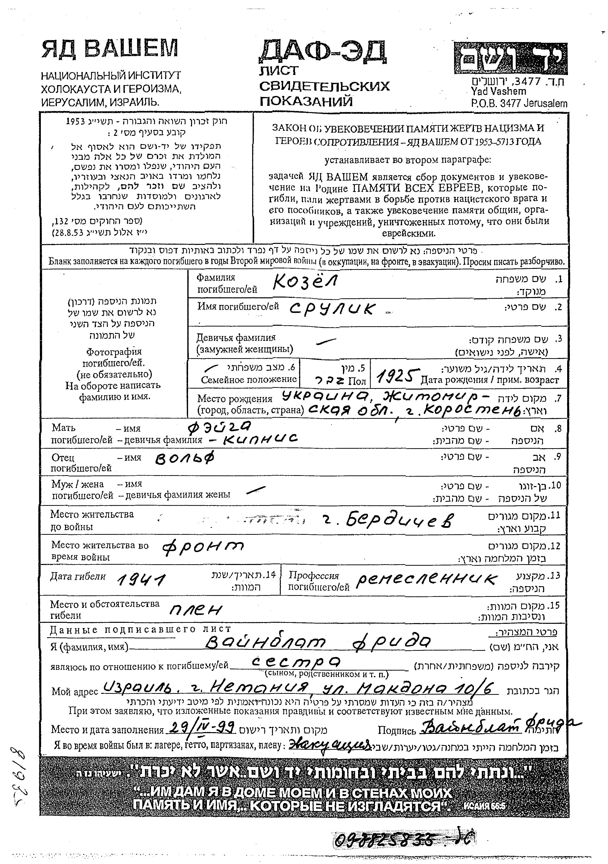 Kozyol Srulik 1925 Berdichev, Ukraine (UdSSR) Gedenkblatt