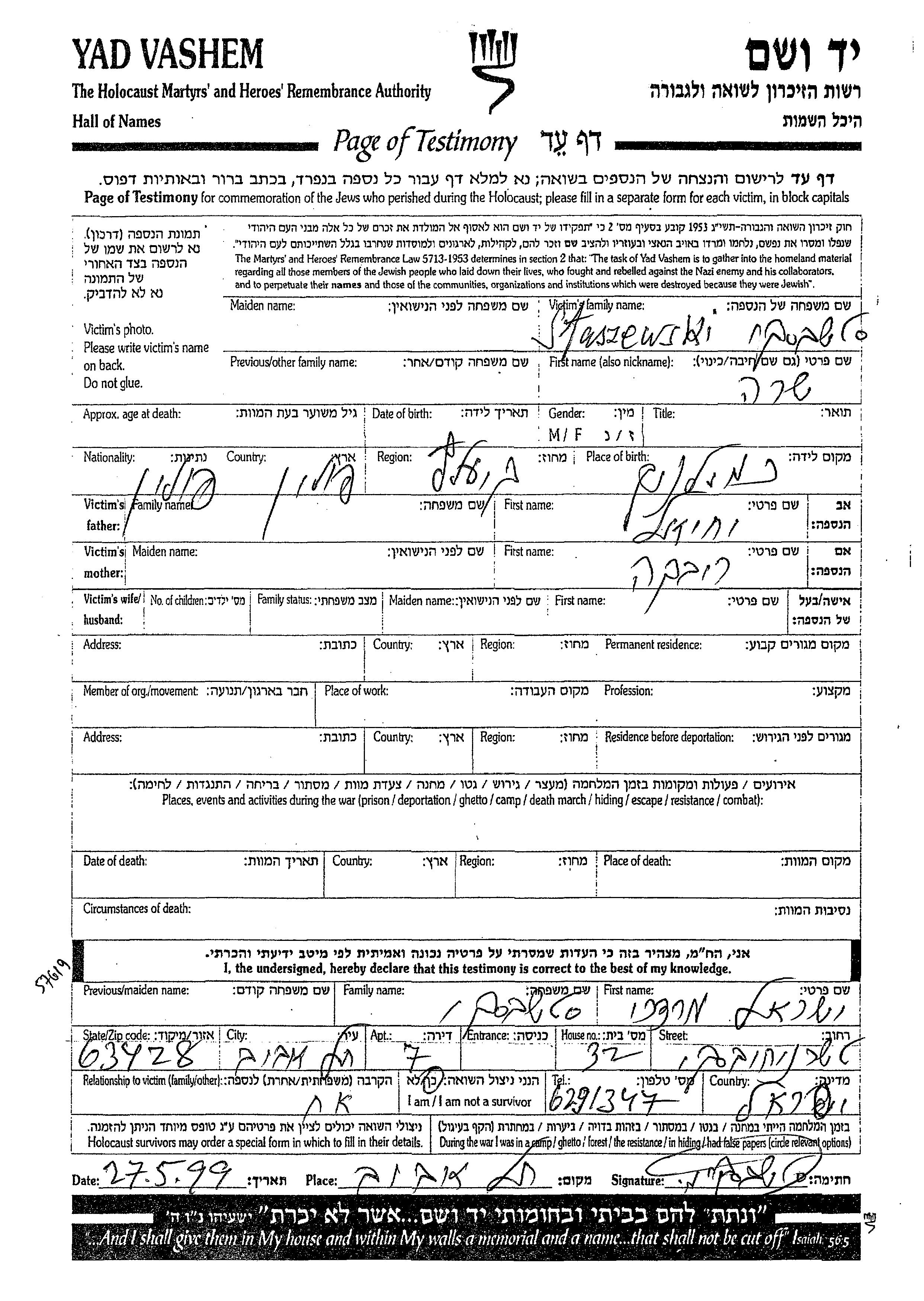 Staszewski Sara unbekannter Ort, Gedenkblatt