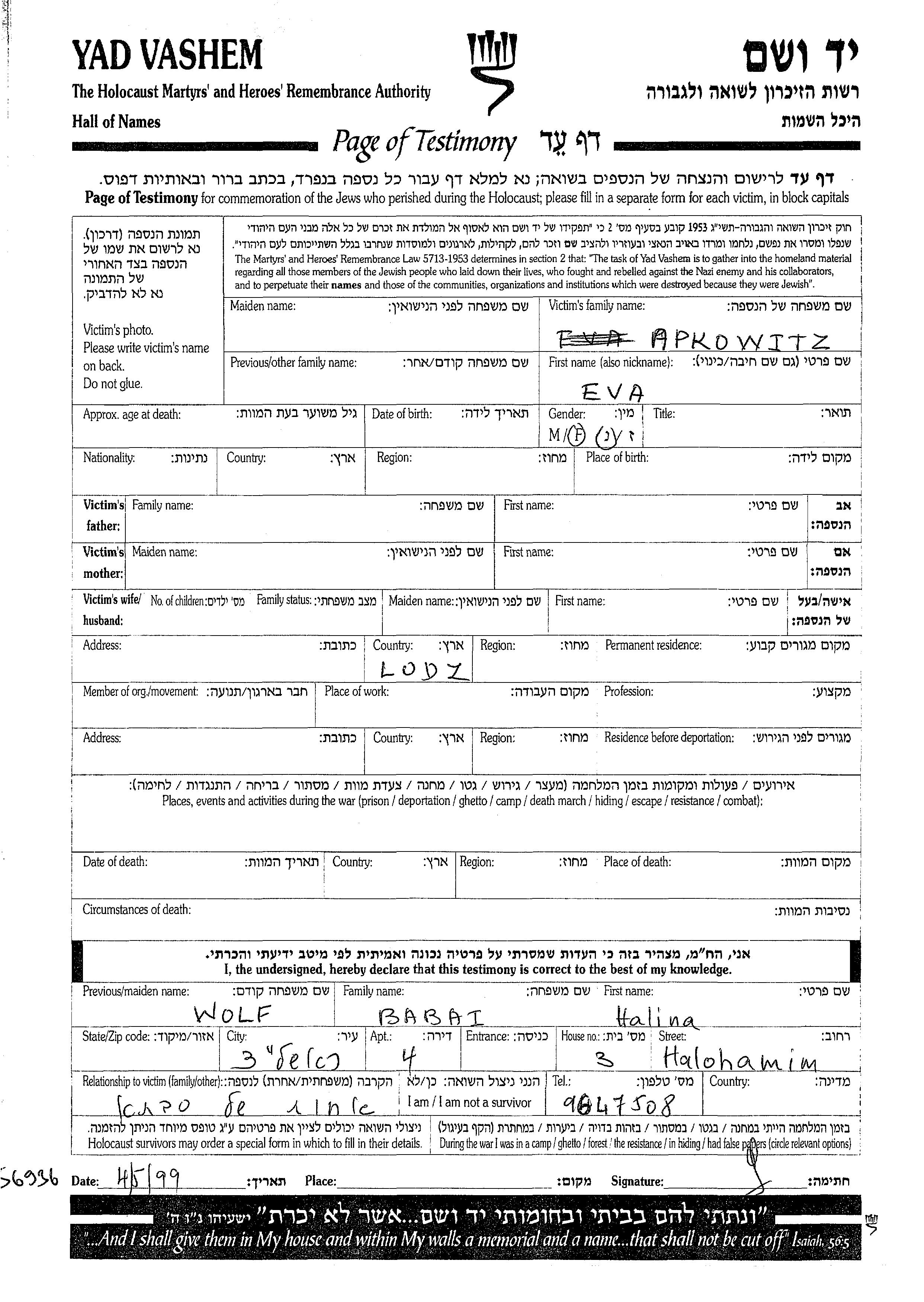 Eva Apkowitz. Vor dem Zweiten Weltkrieg lebte sie in Lodz, Polen.