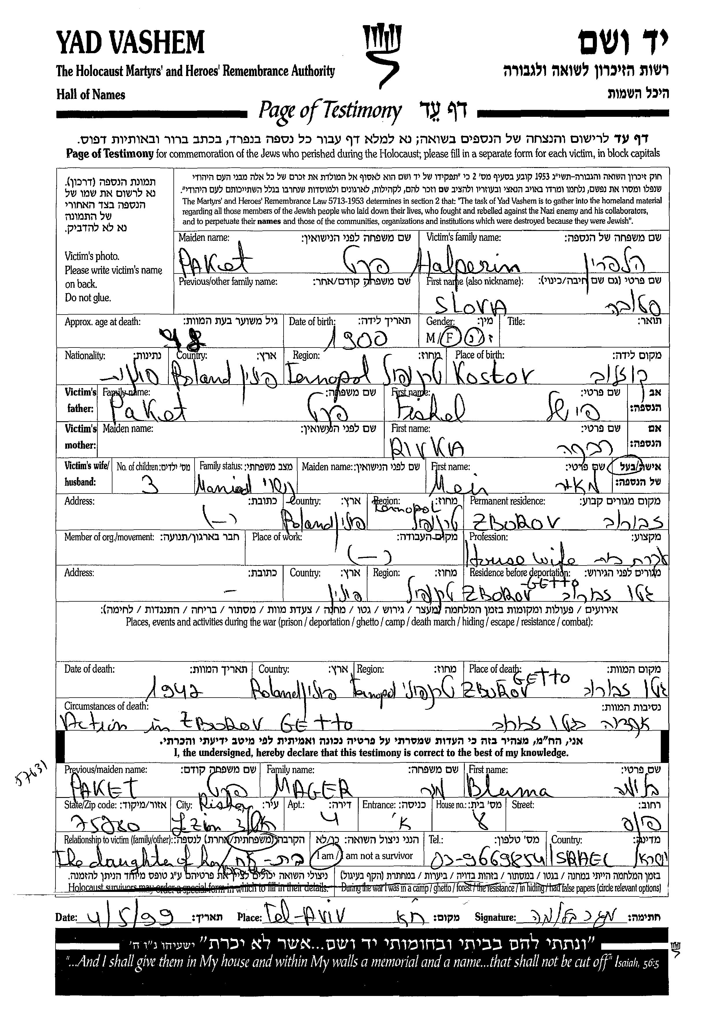 Slava Halperin, geb. Paket wurde im Jahr 1900 in Kozlow, Polen geboren. Sie war die Tochter von Fishel und Rivka. Sie war Hausfrau und mit Meir Verheiratet. Vor dem Zweiten Weltkrieg lebte sie in Zborow, Polen. Während des Krieges war sie in Zborow, Polen.