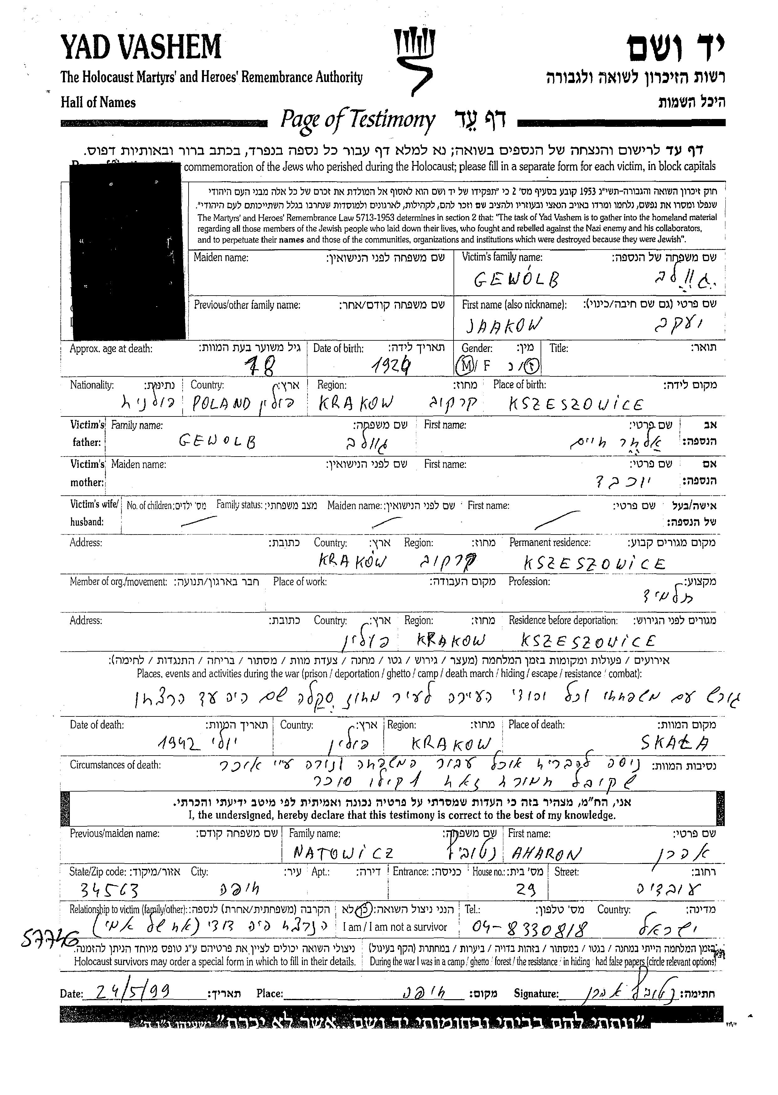 Jaakow Gewolb wurde im Jahr 1924 in Kszeszowice, Polen geboren. Er war der Sohn von Elemer Khaim und Yokheved. Er war Schüler/-in. Vor dem Zweiten Weltkrieg lebte er in Kszeszowice, Polen. Während des Krieges war er in Kszeszowice, Polen.