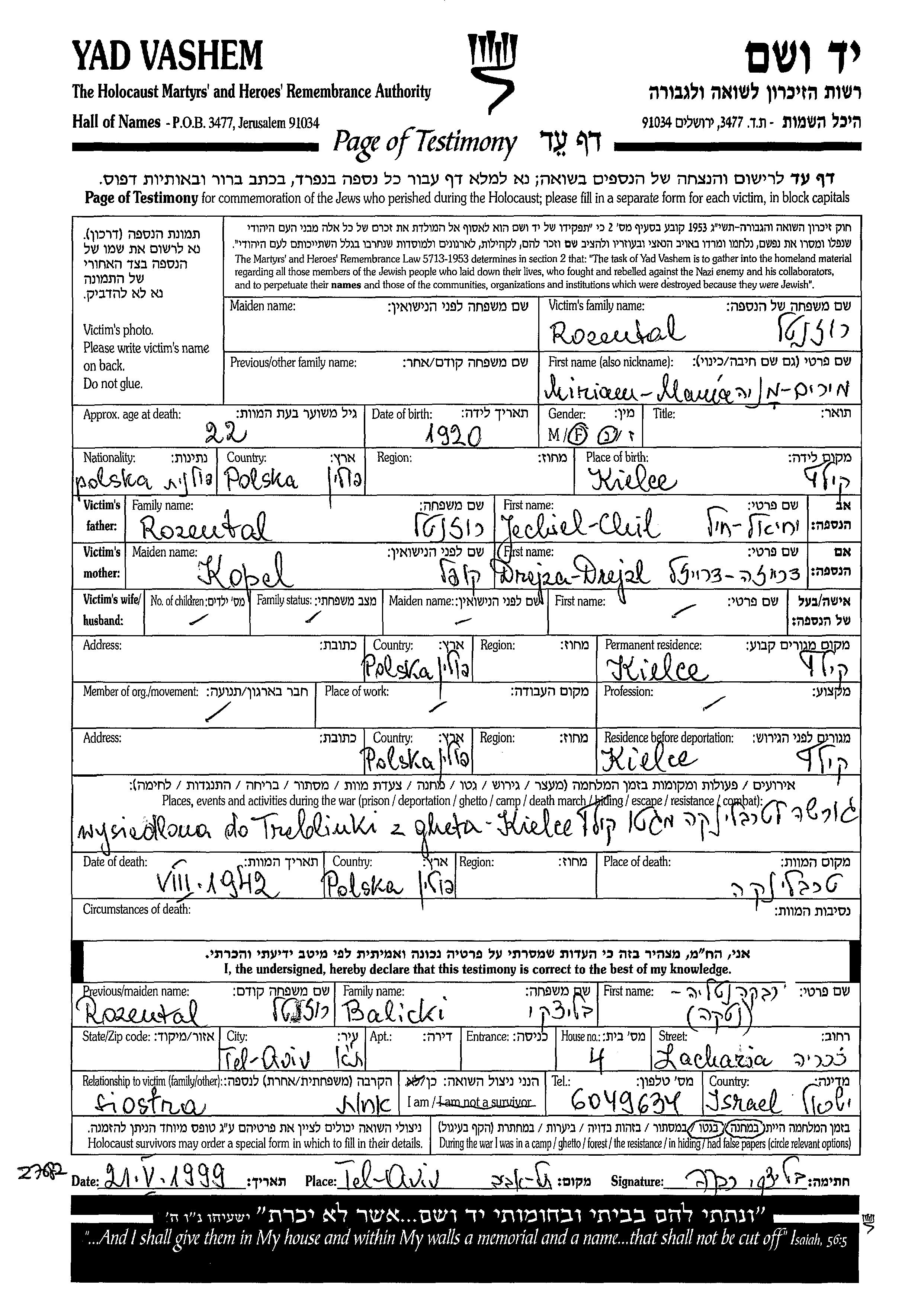 Rozental Miriam Kielce, Polen Liste ermordeter Juden aus Gedenkbuechern (Yizkor Books)