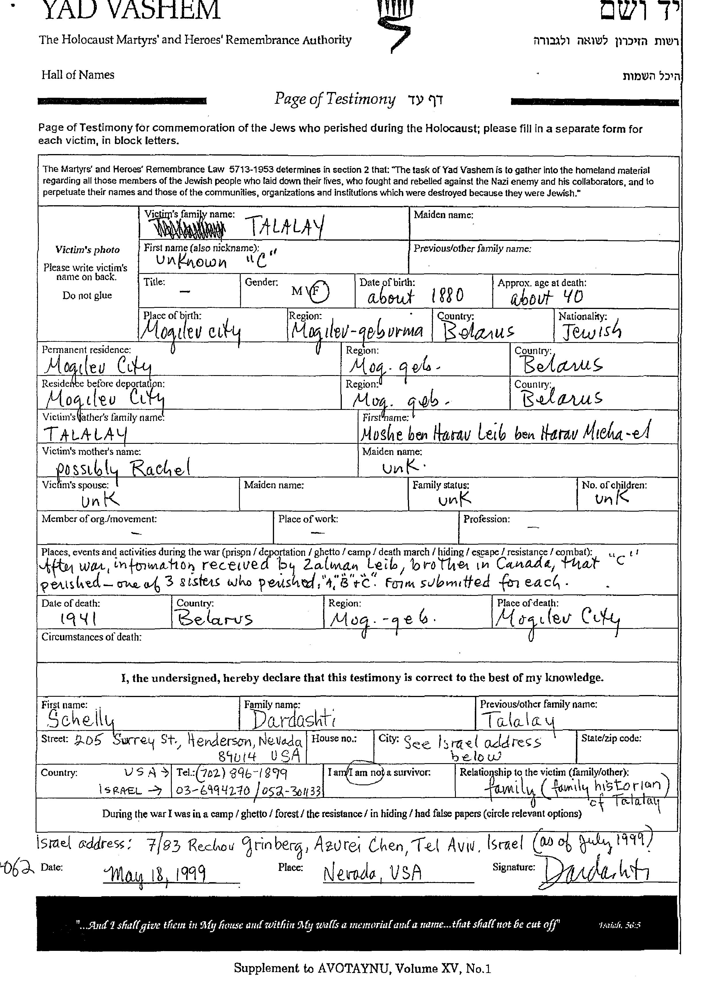 C Talalay wurde im Jahr 1880 in Mogilev, Weißrussland (UdSSR) geboren. Er war der Sohn von Moshe und Rachel. Vor dem Zweiten Weltkrieg lebte er in Mogilev, Weißrussland (UdSSR). Während des Krieges war er in Mogilev, Weißrussland (UdSSR).