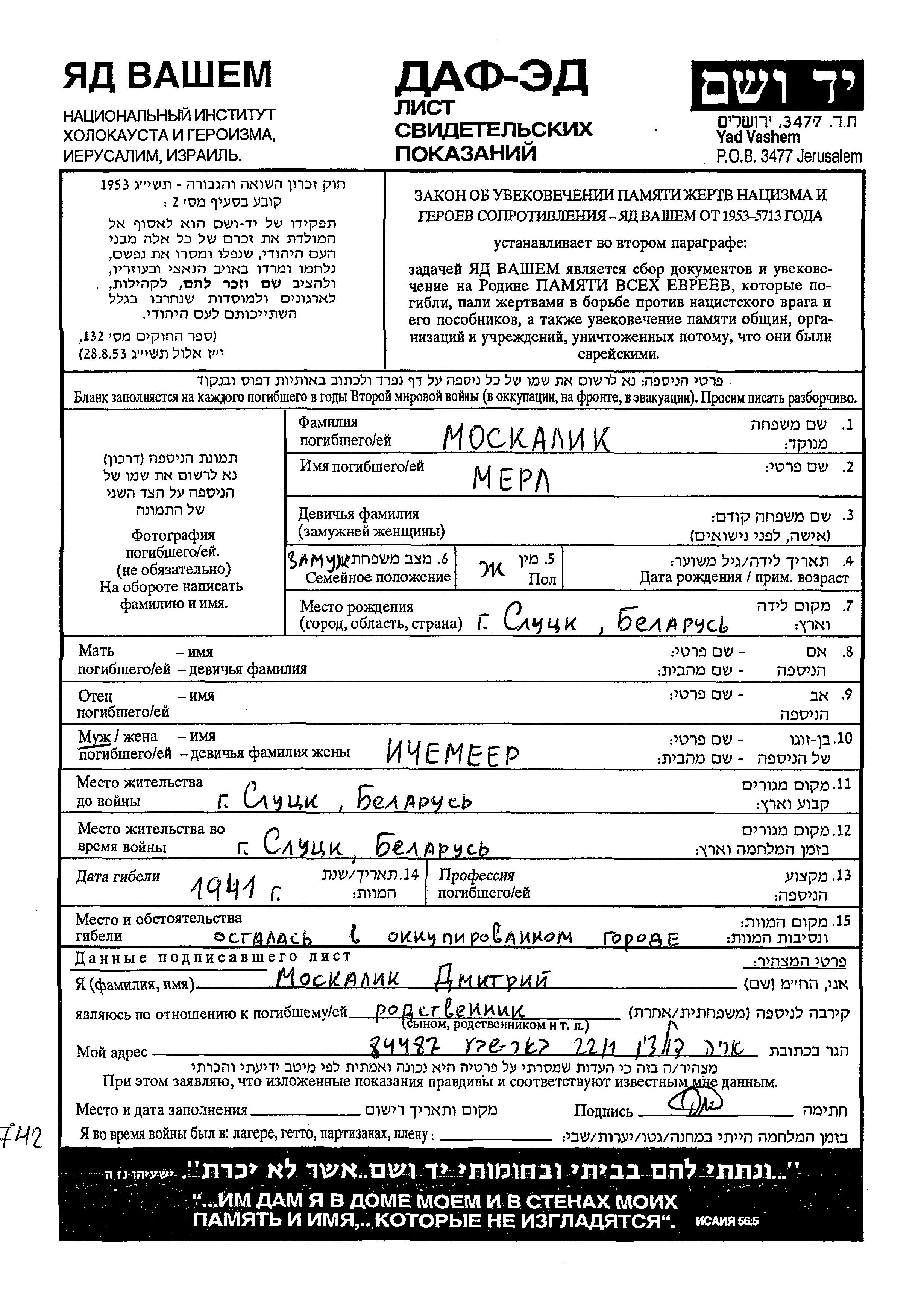 Merl wurde in der Schoah ermordet. Todesort: Sluck, Weißrussland (UdSSR) im Jahr 1941.