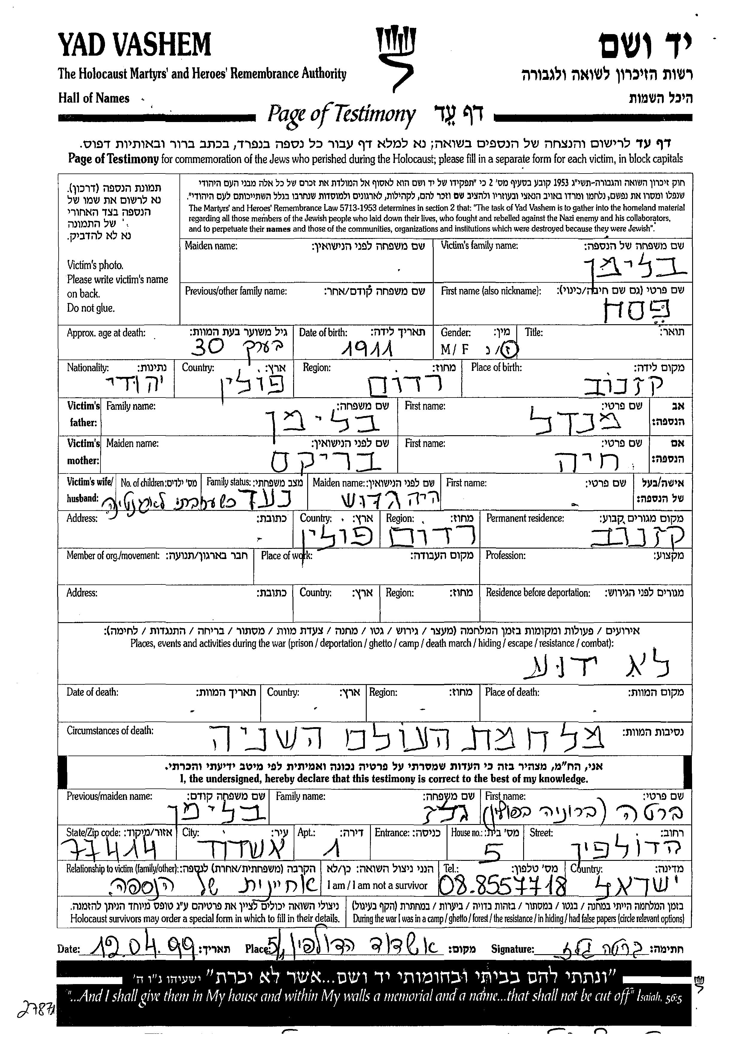 Pesakh Bliman wurde im Jahr 1911 in Kazanow, Polen geboren. Er war der Sohn von Mendel und Khaia. Er war Geschieden. Vor dem Zweiten Weltkrieg lebte er in Kazanow, Polen.