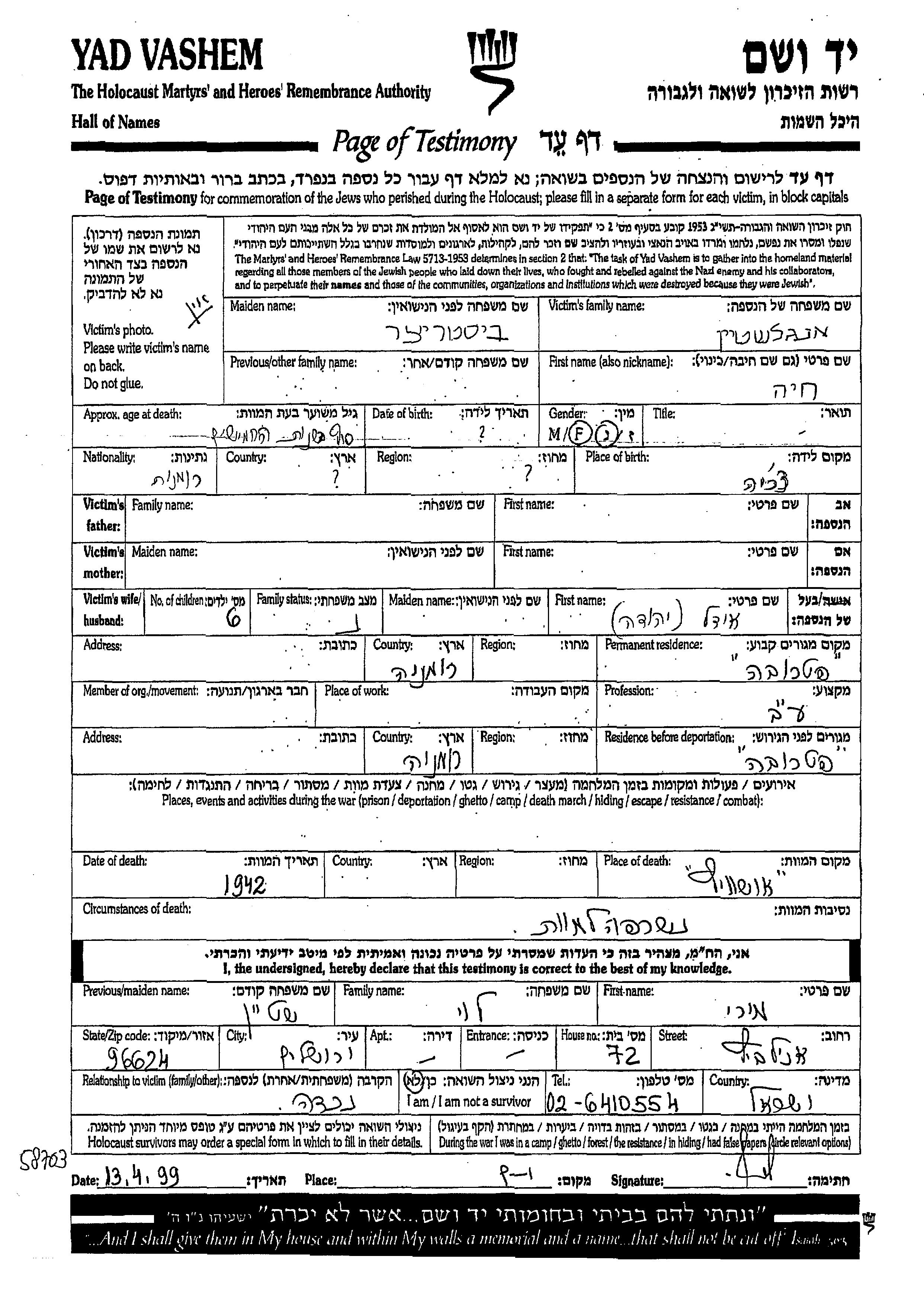 Khaia Engelshtein, geb. Bistritcer wurde in Tschechoslowakei geboren. Sie war Hausfrau und mit Idl Verheiratet. Vor dem Zweiten Weltkrieg lebte sie in Petrova, Rumänien. Während des Krieges war sie in Petrova, Rumänien.