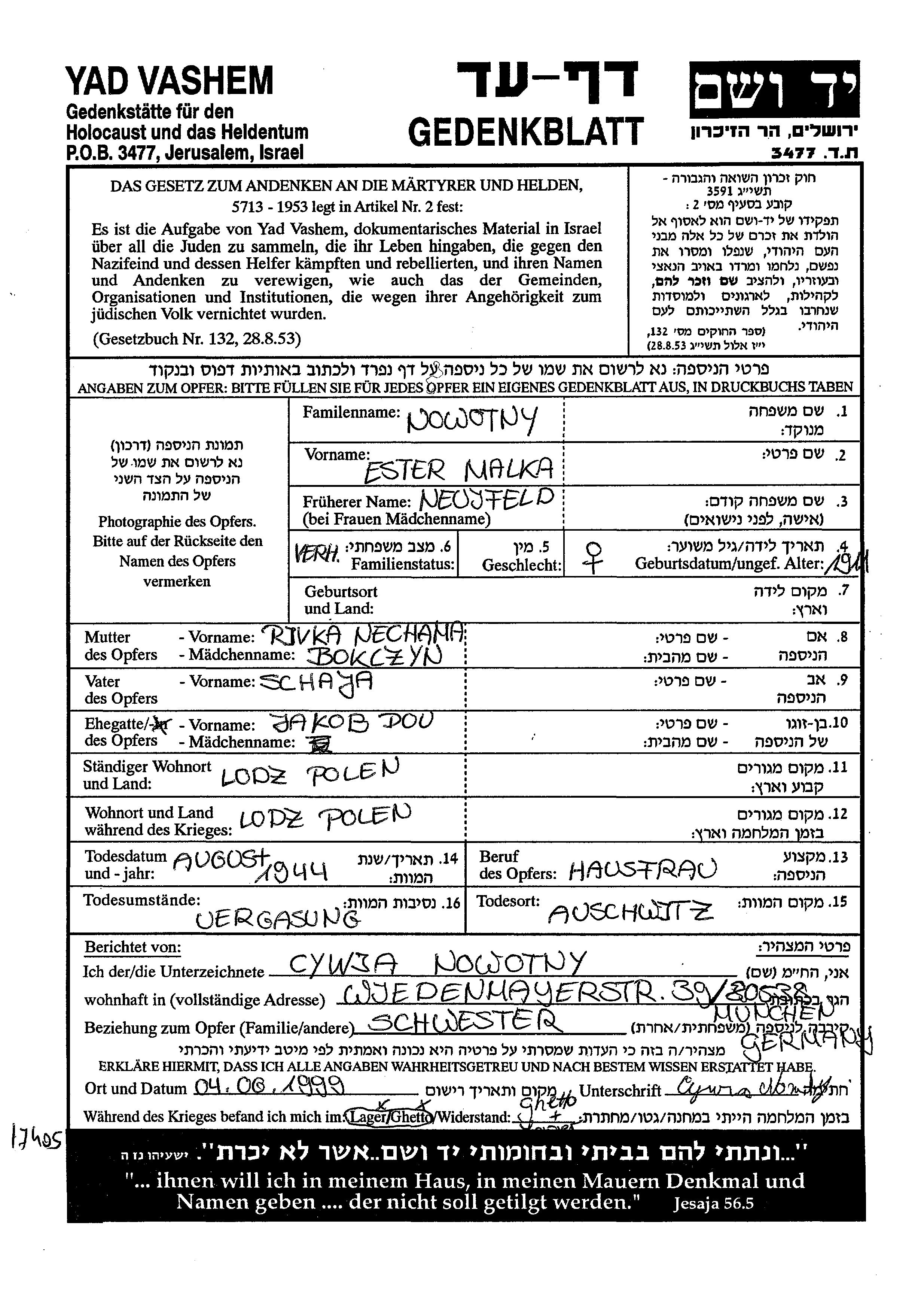 Ester Malka Nowotny, geb. Neujfeld wurde im Jahr 1914 geboren. Sie war die Tochter von Schaja und Rivka Nechama. Sie war Hausfrau und mit Jakob Dov Verheiratet. Vor dem Zweiten Weltkrieg lebte sie in Lodz, Polen. Während des Krieges war sie in Lodz, Polen.