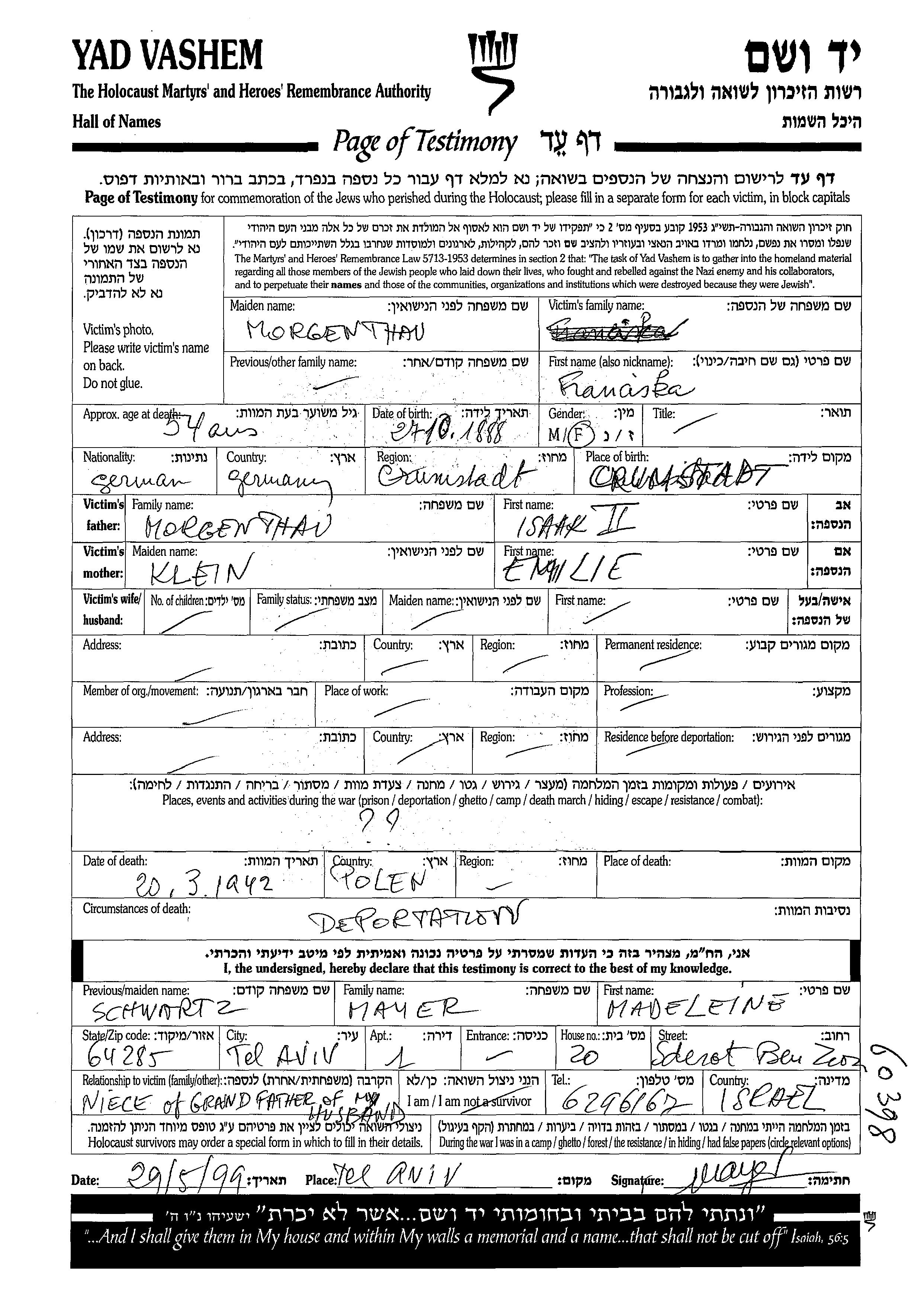 Franciska Morgenthau wurde im Jahr 1888 in Crumstadt, Deutsches Reich geboren. Sie war die Tochter von Isaak und Emilie.