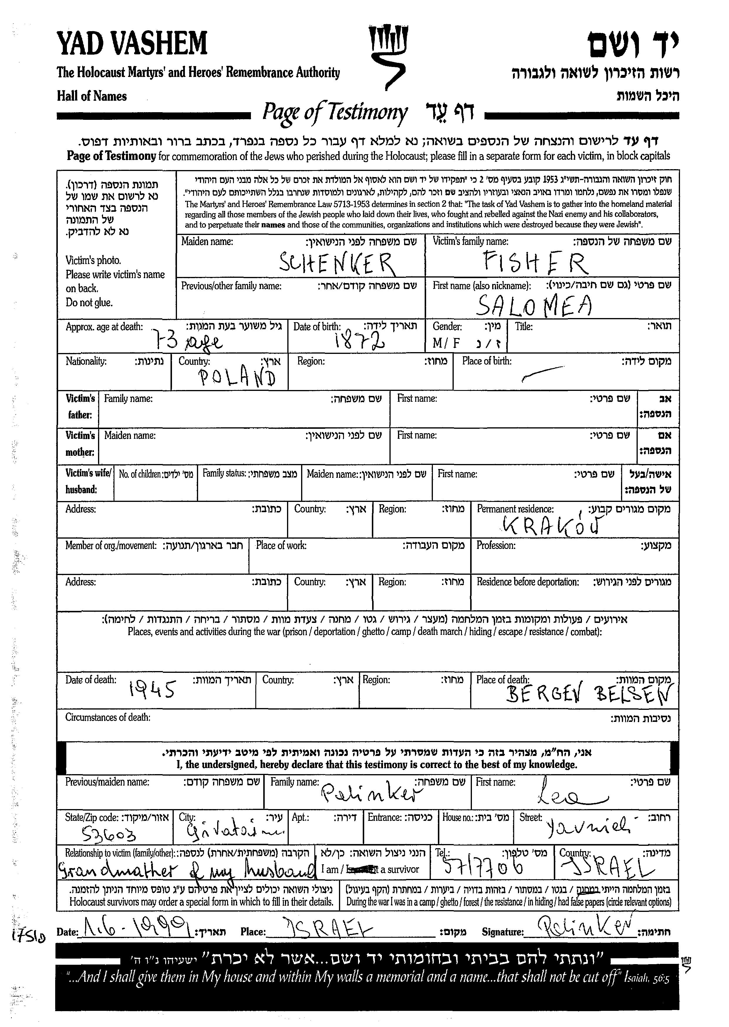 Salomea Fisher, geb. Schenker wurde im Jahr 1872 in Polen geboren. Vor dem Zweiten Weltkrieg lebte sie in Krakow, Polen.