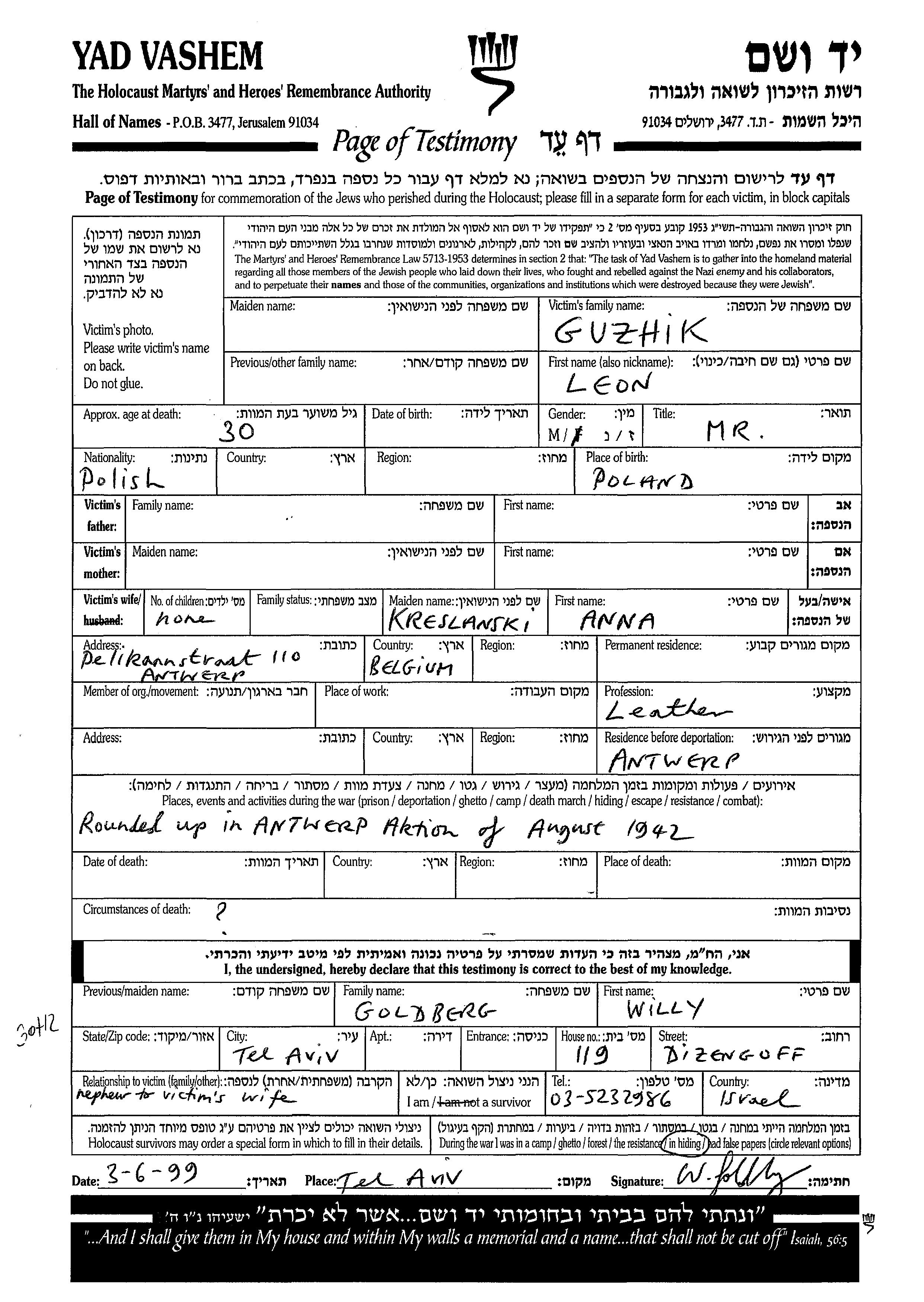Leon Guzhik wurde in Polen geboren. Er war Lederarbeiter und mit Anna, geb. Kreslanski Verheiratet. Vor dem Zweiten Weltkrieg lebte er in Antwerpen, Belgien. Während des Krieges war er in Antwerpen, Belgien.