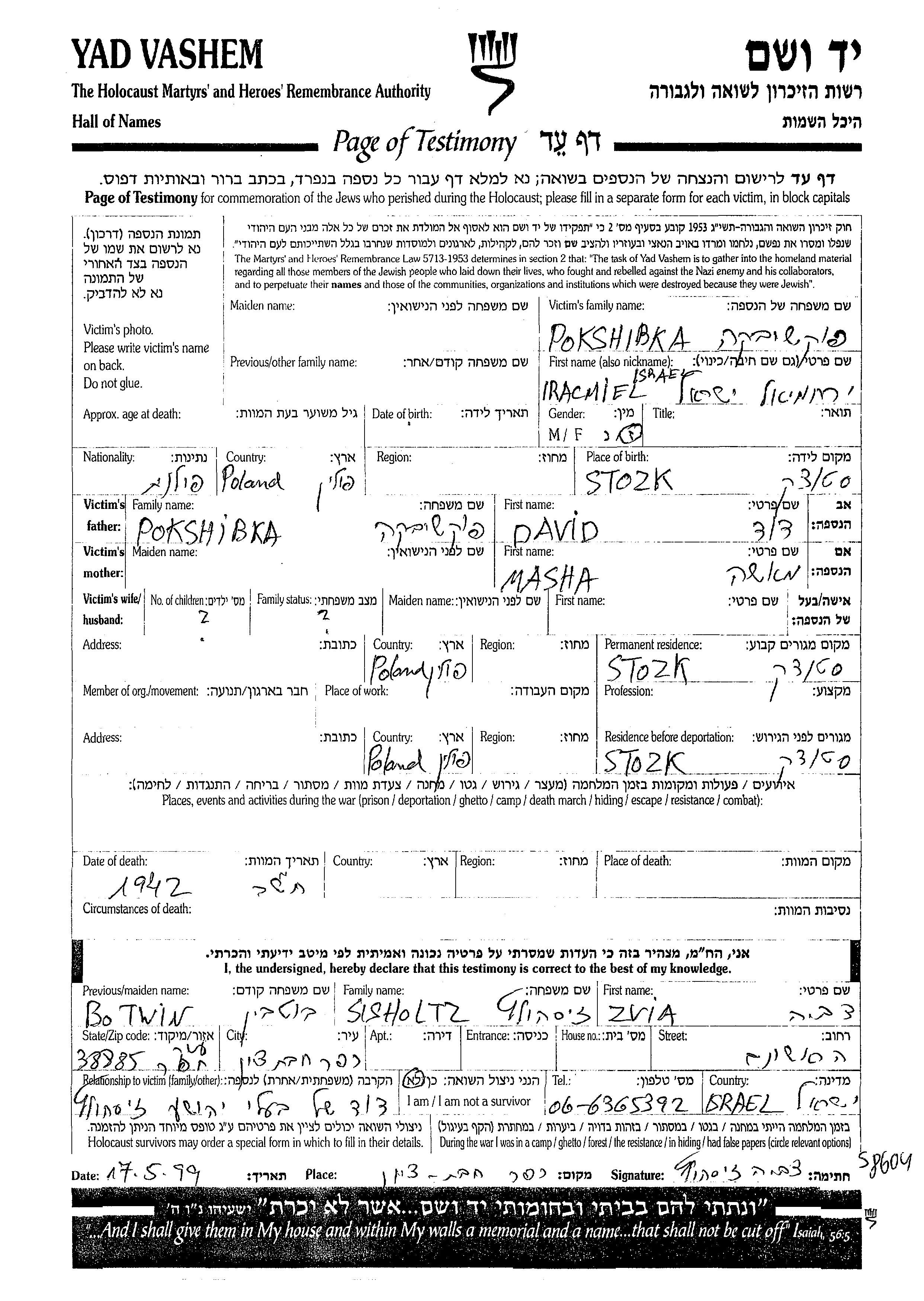 Pokshibka Irachmiel Israel Stoczek, Polen Gedenkblatt