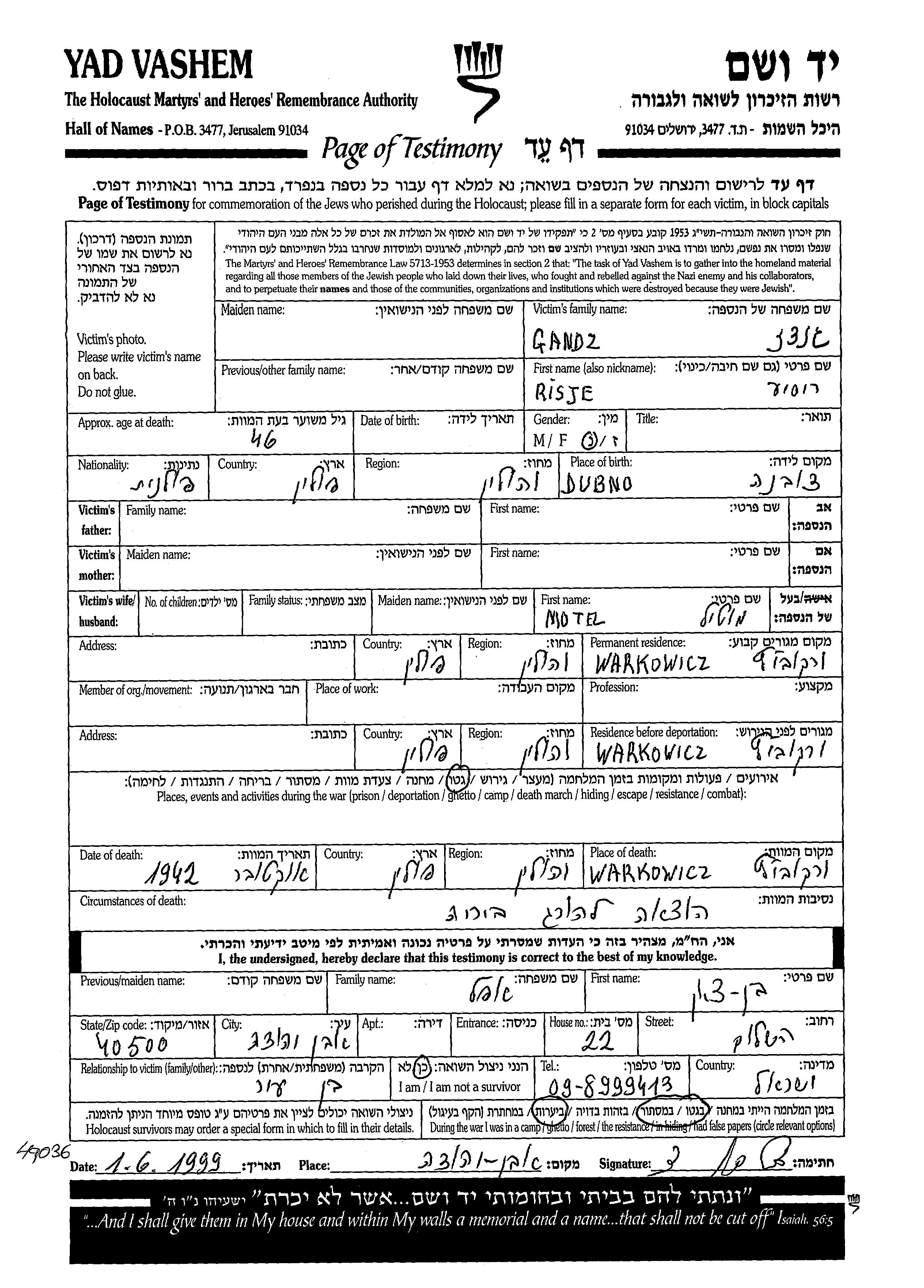 Gandz Risje Warkowiczy, Polen Gedenkblatt