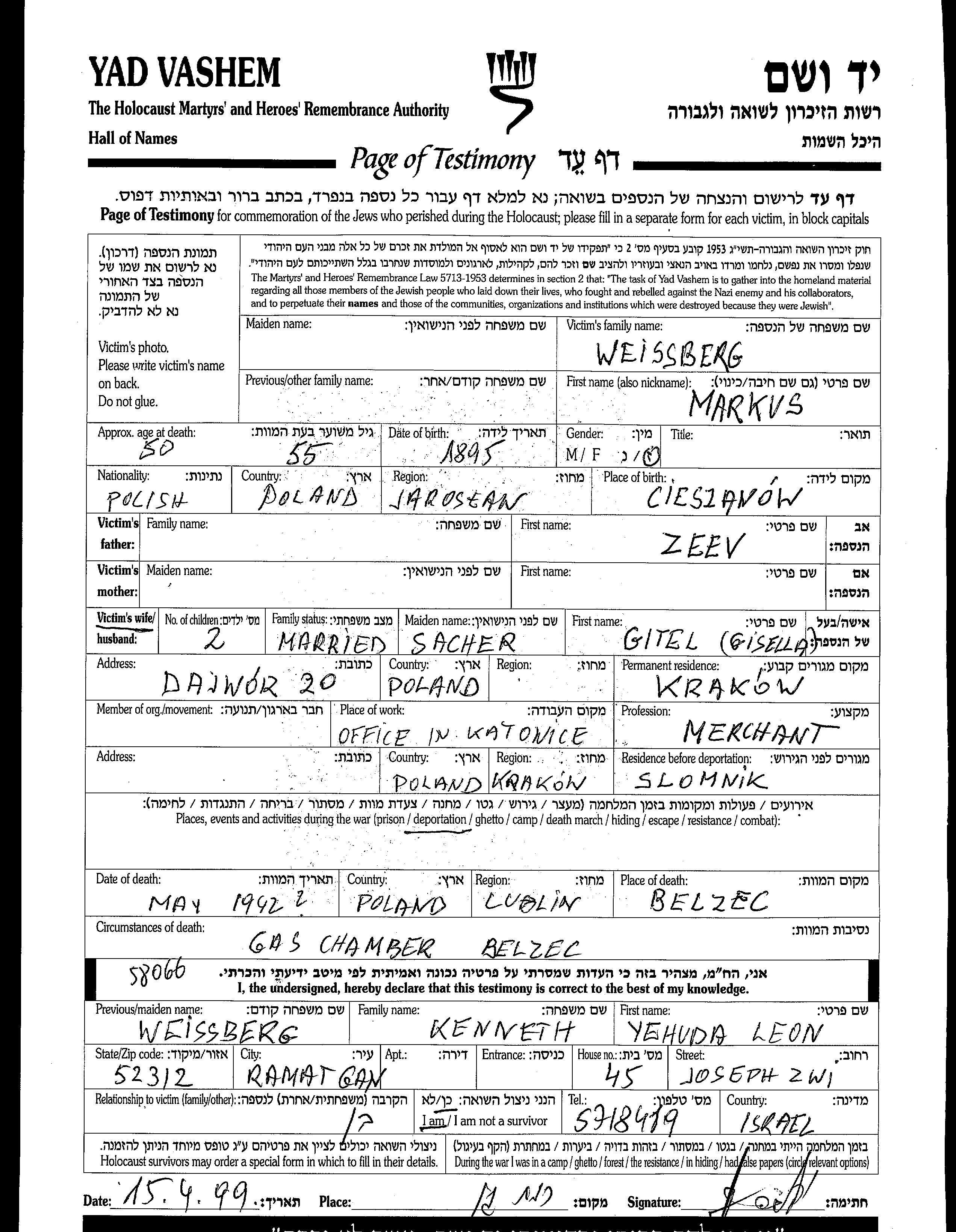 Markus Weissberg wurde im Jahr 1895 in Cieszanow, Polen geboren. Er war der Sohn von Zeev. Er war Kaufmann/-frau und mit Gisella Gitel, geb. Sacher Verheiratet. Vor dem Zweiten Weltkrieg lebte er in Krakow, Polen. Während des Krieges war er in Slomnik, Polen.
