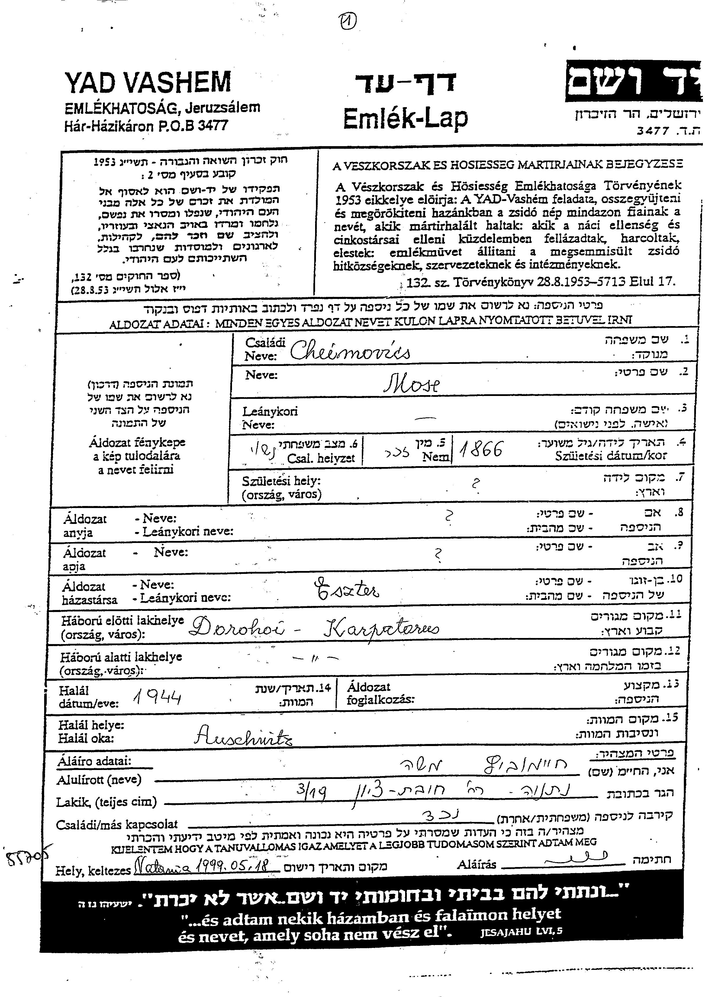 Mose Cheimovics wurde im Jahr 1866 geboren. Er war mit Eszter Verheiratet. Vor dem Zweiten Weltkrieg lebte er in Dorohoi, Rumänien. Während des Krieges war er in Dorohoi, Rumänien.