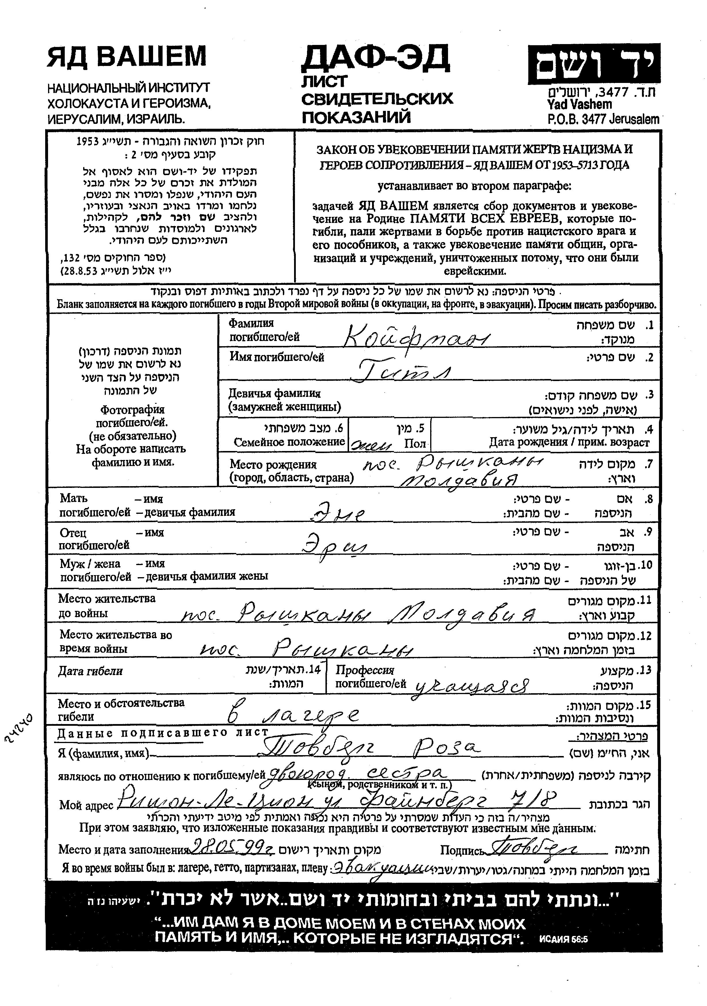 Koifman Gitl Ryshkany, Rumänien Gedenkblatt