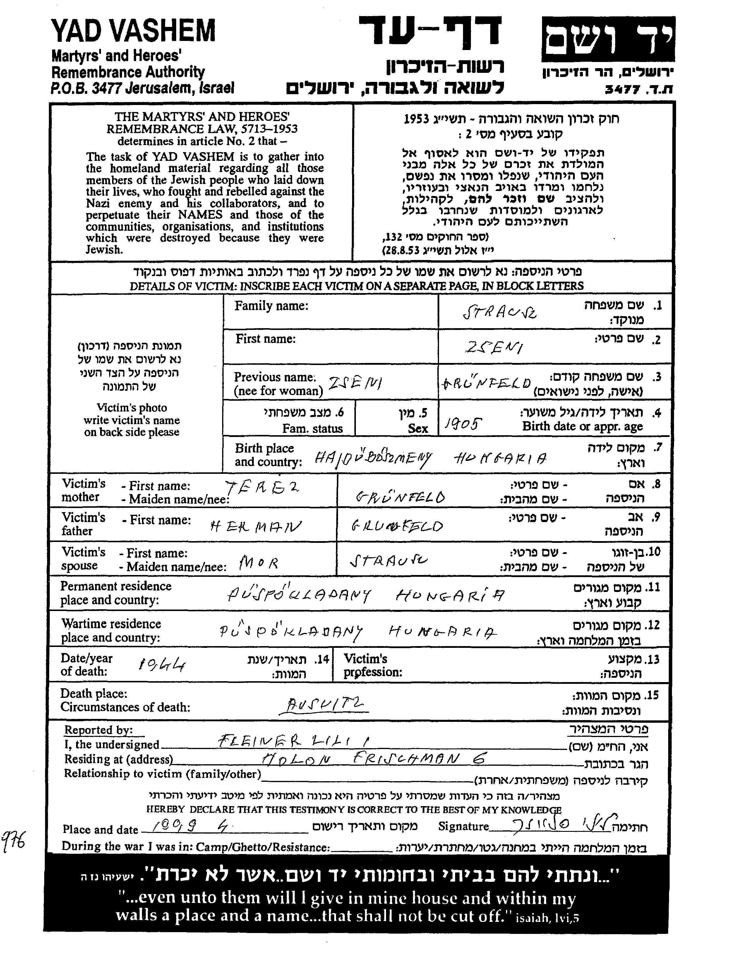 Zseni Strausz, geb. Grunfeld wurde im Jahr 1905 in Hajduboszormeny, Ungarn geboren. Sie war die Tochter von Herman und Terez. Sie war mit Mor Verheiratet. Vor dem Zweiten Weltkrieg lebte sie in Puspokladany, Ungarn. Während des Krieges war sie in Puspokladany, Ungarn.