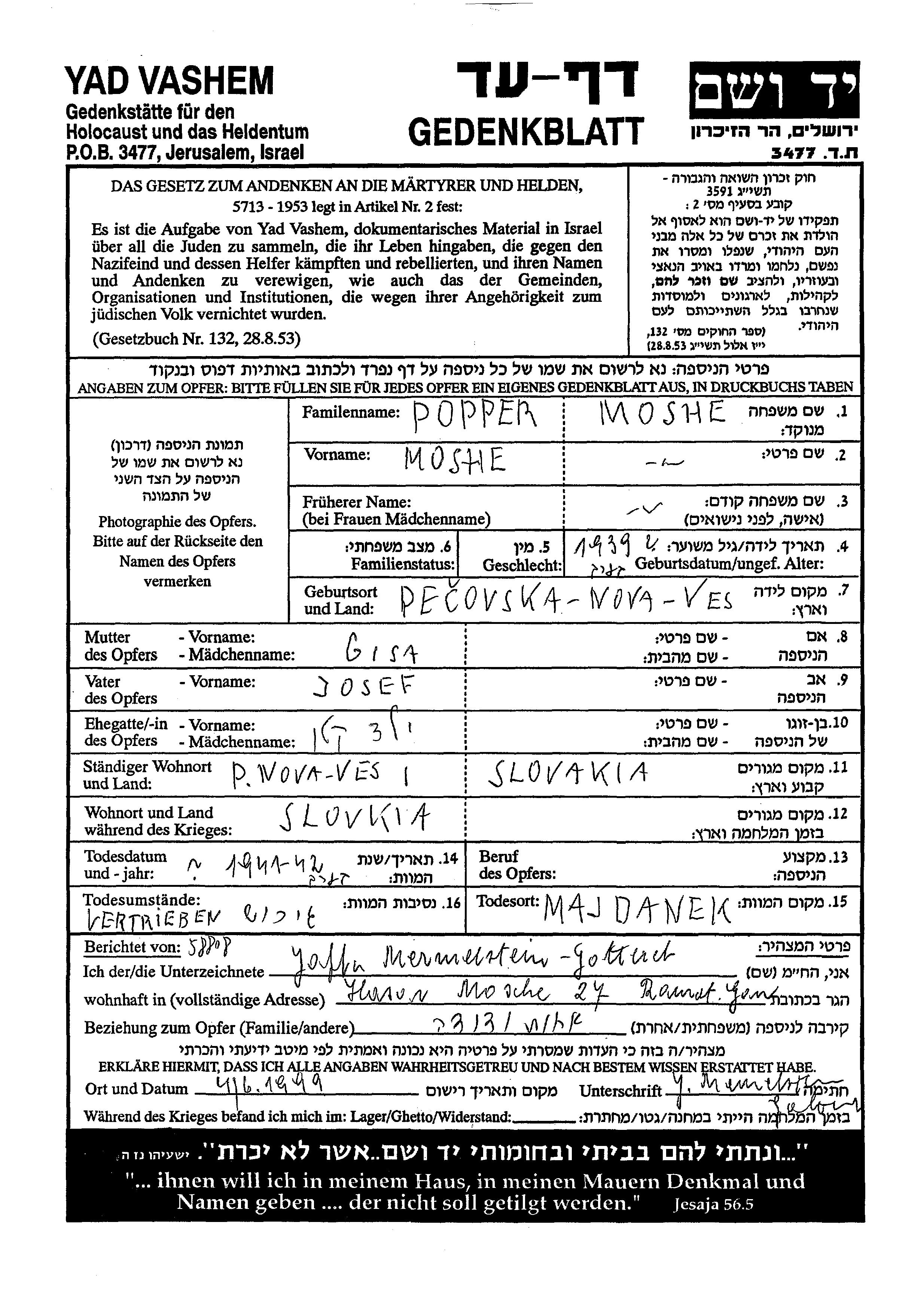 Moshe Popper wurde im Jahr 1939 in Pecovska Nova Ves, Tschechoslowakei geboren. Er war der Sohn von Josef und Gisa. Vor dem Zweiten Weltkrieg lebte er in Pecovska Nova Ves, Tschechoslowakei. Während des Krieges war er in Slovakia, Tschechoslowakei.