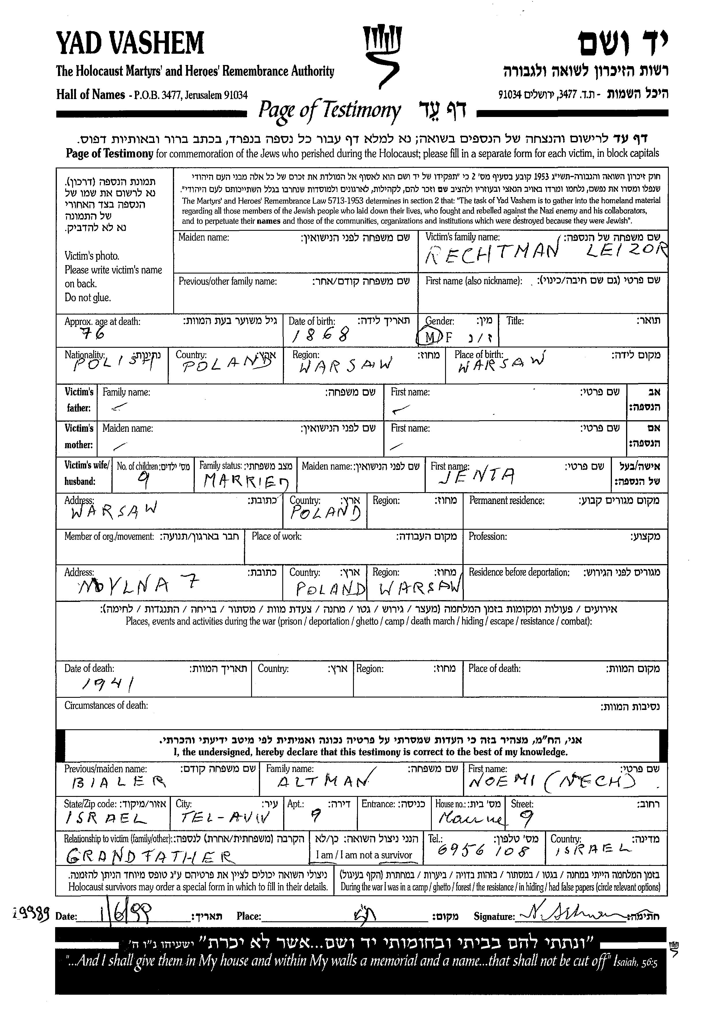 Leizor Rechtman wurde im Jahr 1868 in Warszawa, Polen geboren. Er war mit Jenta Verheiratet. Vor dem Zweiten Weltkrieg lebte er in Polen. Während des Krieges war er in Warszawa, Polen.