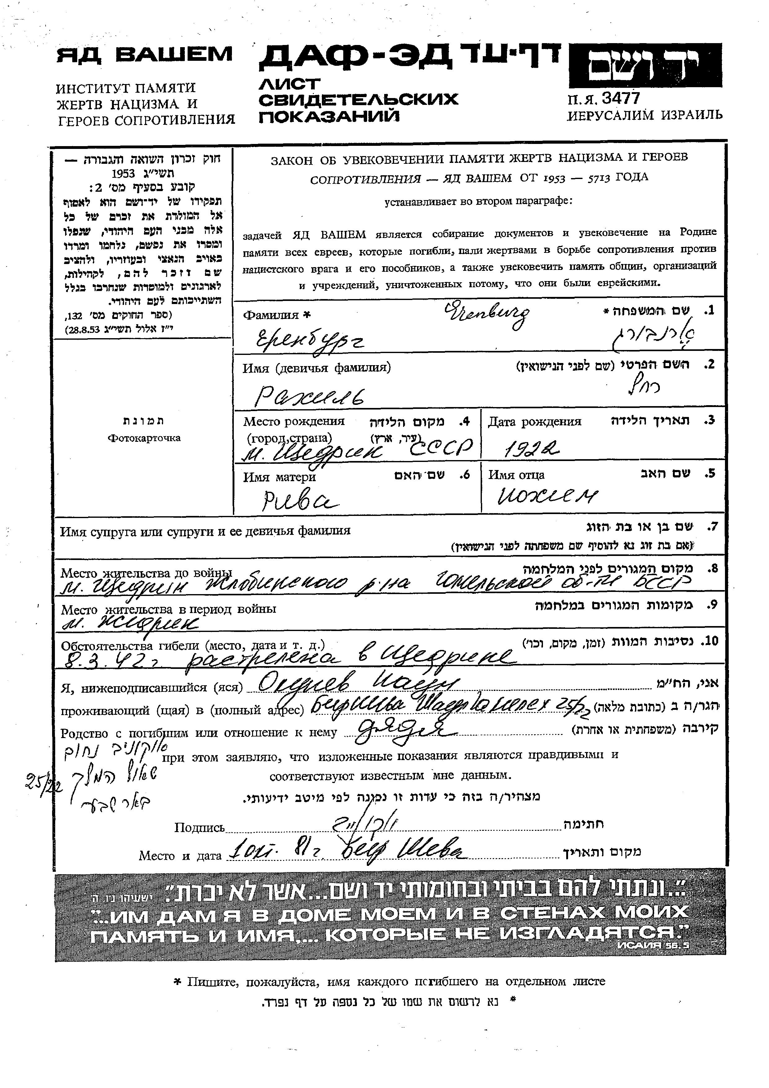 Yerenburg Rakhil 1923 Shchedrin, Weißrussland (UdSSR) Verfolgtenliste