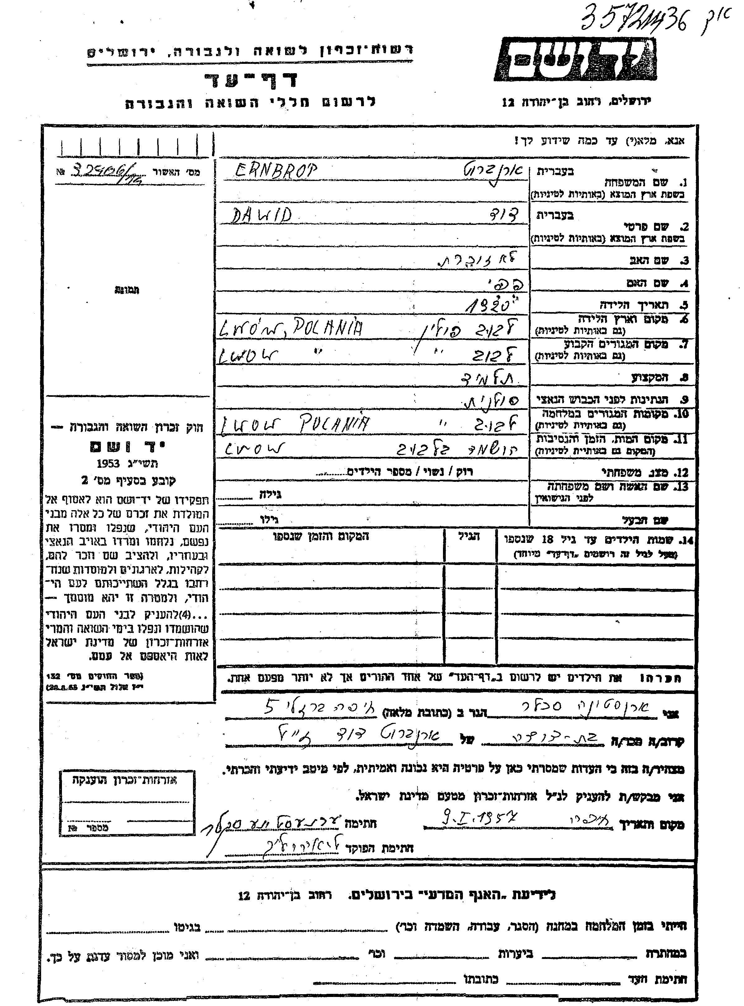 Dawid Ernbrot wurde im Jahr 1920 in Lwow, Polen geboren. Er war der Sohn von Pepi. Er war Schüler/-in. Vor dem Zweiten Weltkrieg lebte er in Lwow, Polen. Während des Krieges war er in Lwow, Polen.