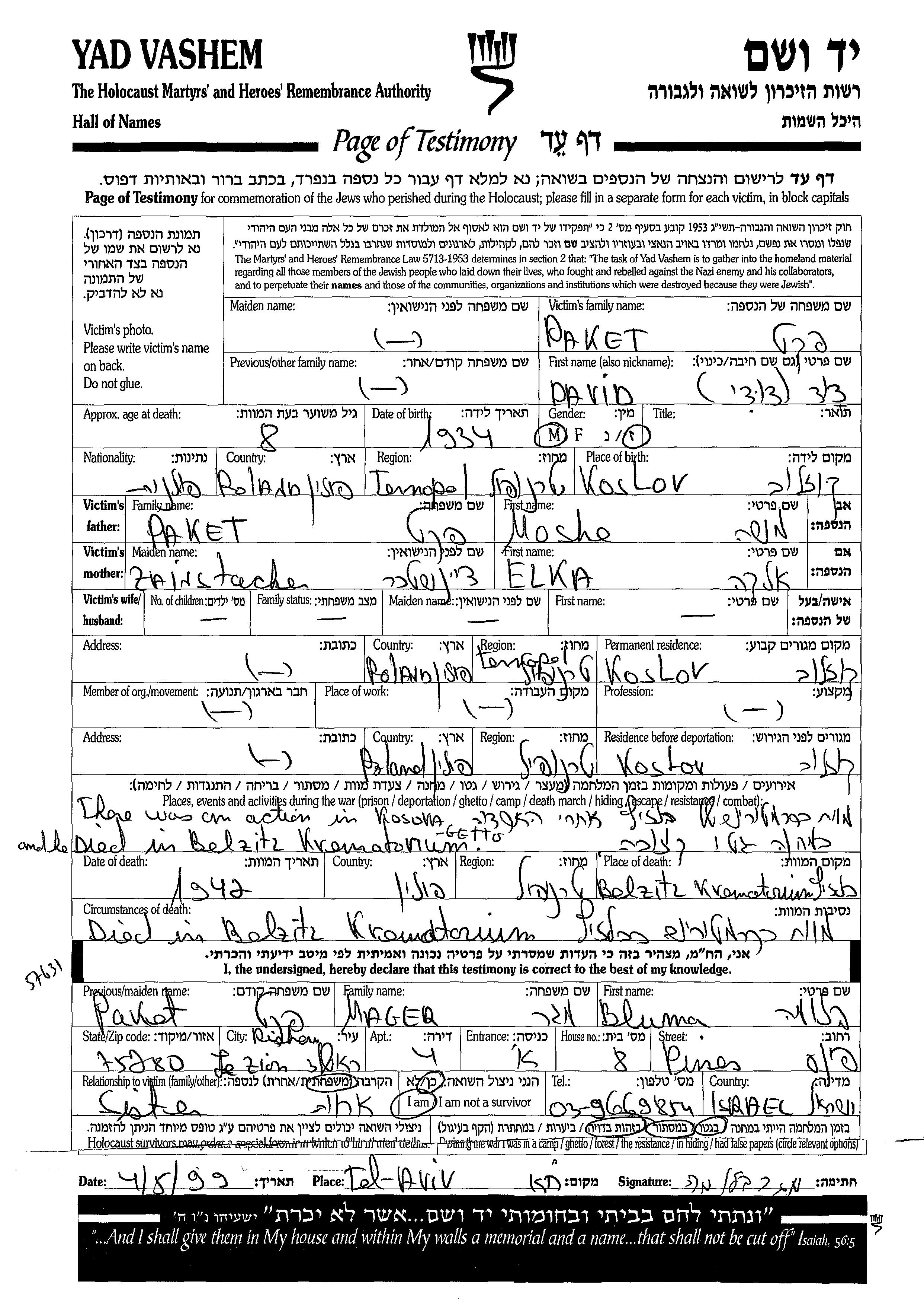 David Paket wurde im Jahr 1934 in Kozlov, Polen geboren. Er war der Sohn von Moshe und Elka. Vor dem Zweiten Weltkrieg lebte er in Kozlov, Polen. Während des Krieges war er in Kozlov, Polen.