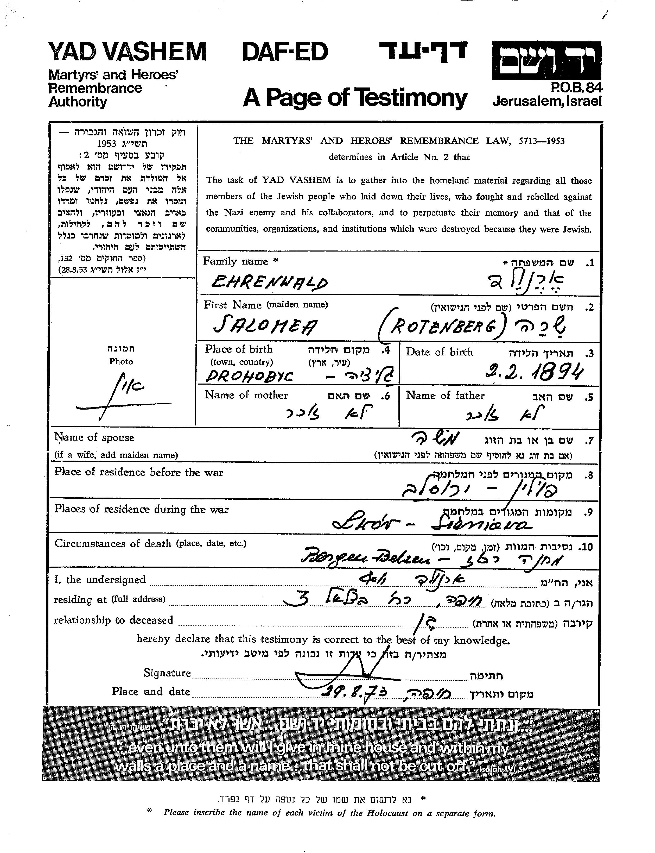 Salomea Sara Ehrenwald Arnold, geb. Rotenberg wurde im Jahr 1894 in Drohobycz, Polen geboren. Vor dem Zweiten Weltkrieg lebte sie in Jaroslaw, Polen. Während des Krieges war sie in Sieniawa, Polen.