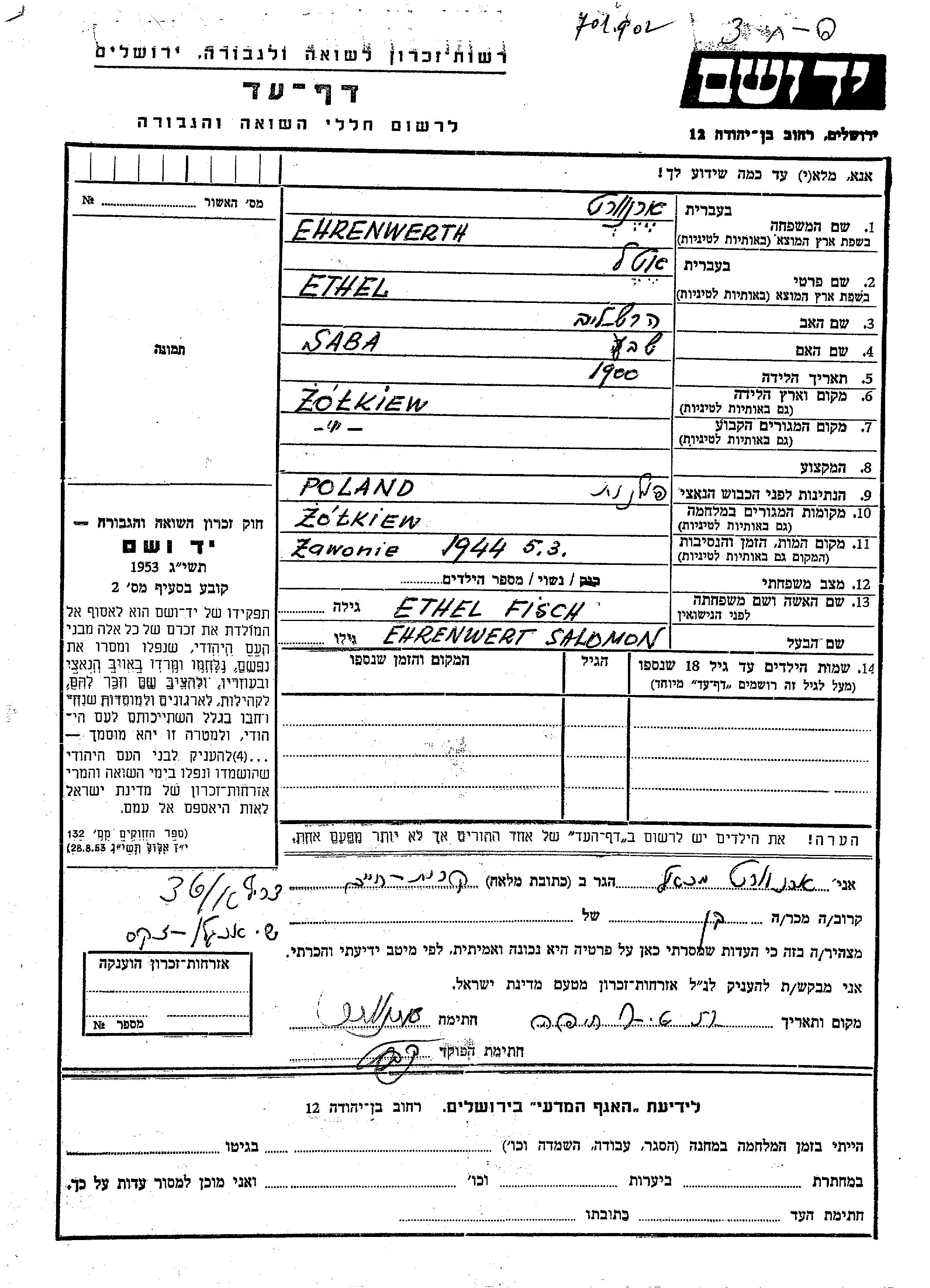 Ethel Ehrenwerth, geb. Fisch wurde im Jahr 1900 in Zolkiew, Polen geboren. Sie war die Tochter von Hersh Leib und Sava. Sie war mit Salomon Verheiratet. Vor dem Zweiten Weltkrieg lebte sie in Zolkiew, Polen. Während des Krieges war sie in Zolkiew, Polen.