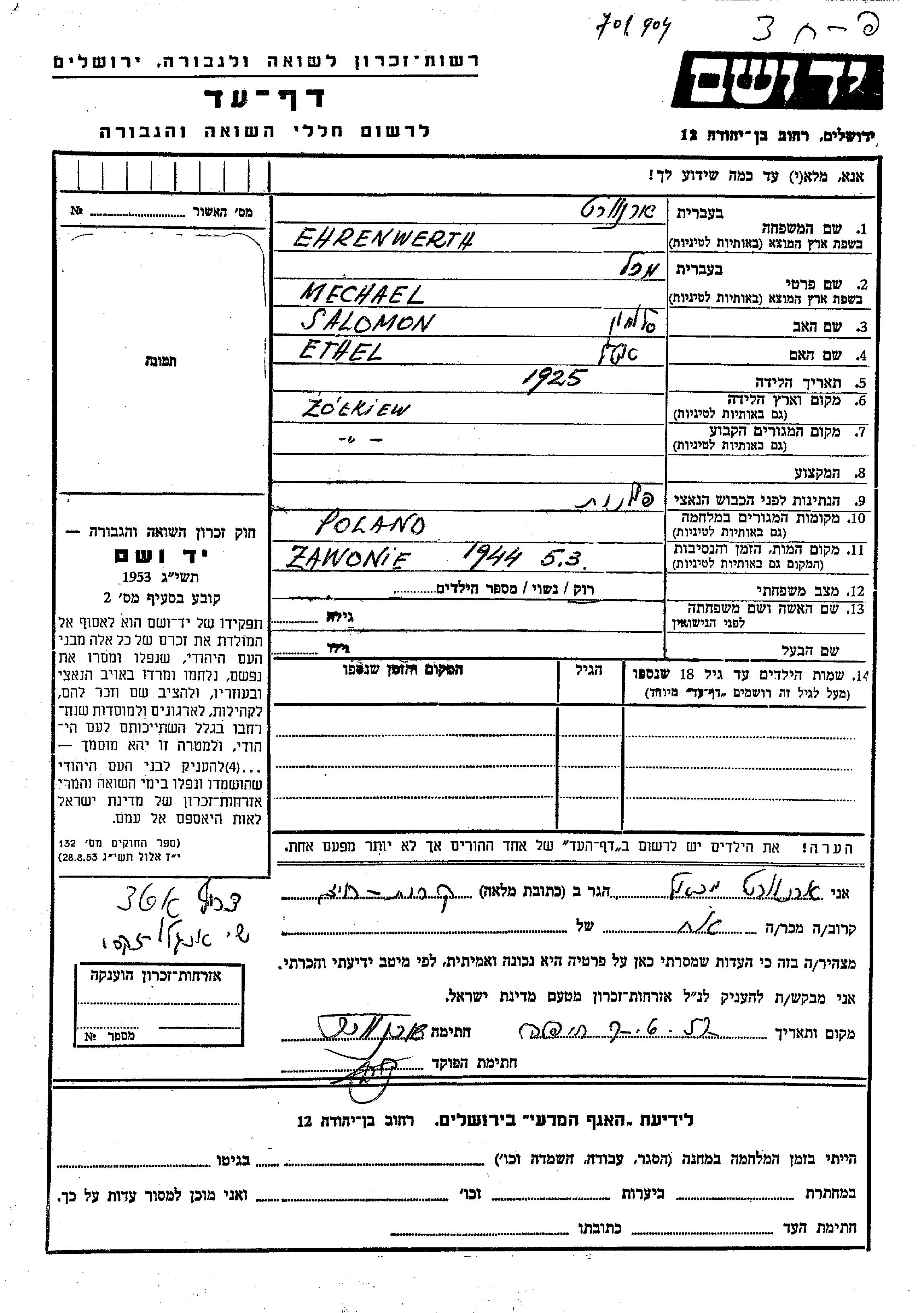 Mechael Ehrenwerth wurde im Jahr 1925 in Zolkiew, Polen geboren. Er war der Sohn von Salomon und Ethel. Er war Ledig. Vor dem Zweiten Weltkrieg lebte er in Zolkiew, Polen. Während des Krieges war er in Polen.