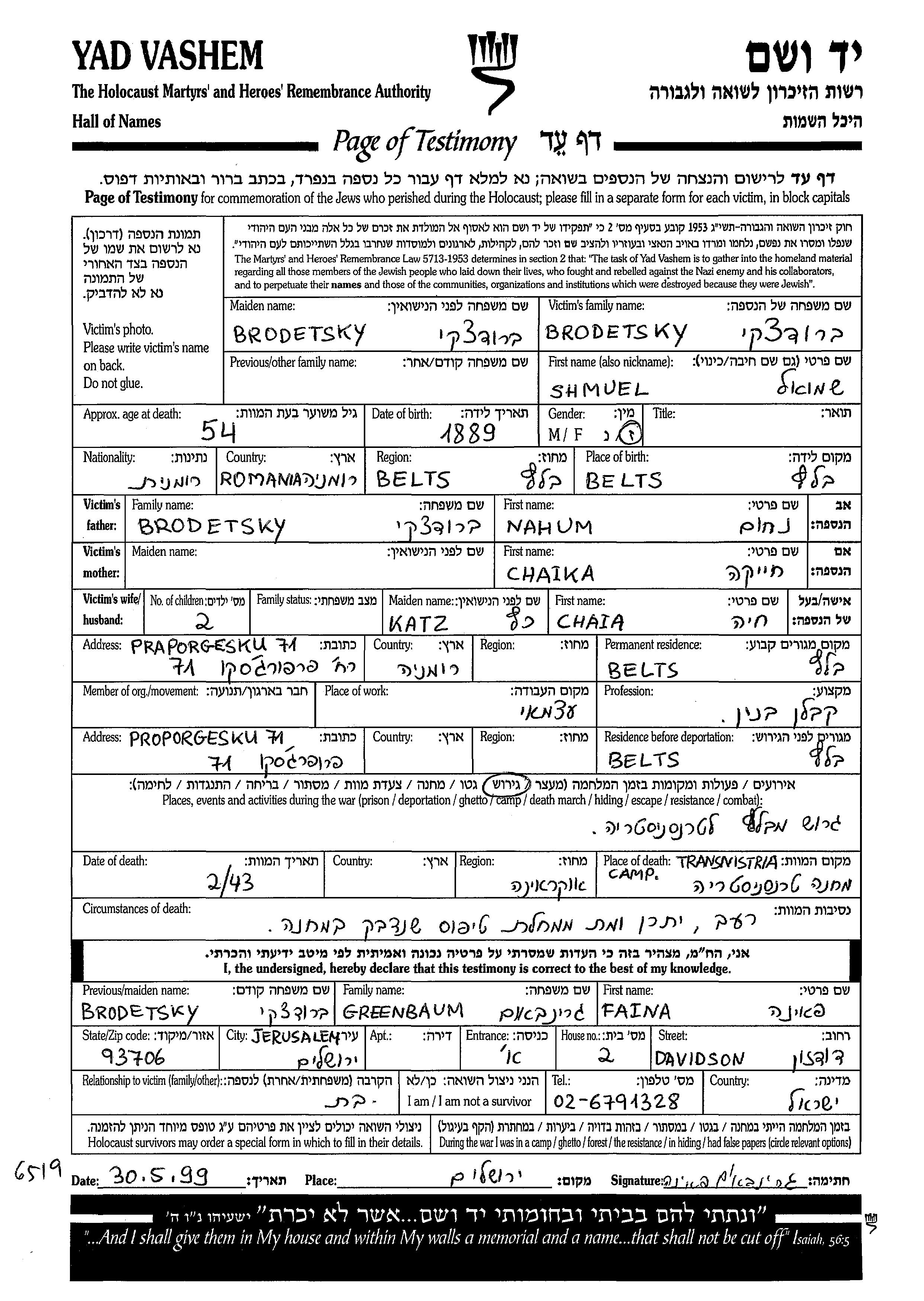 Shmuel Brodetsky wurde im Jahr 1889 in Beltz, Rumänien geboren. Er war der Sohn von Nahum und Chaika. Er war Baunternehmer und mit Chaia, geb. Katz Verheiratet. Vor dem Zweiten Weltkrieg lebte er in Beltz, Rumänien. Während des Krieges war er in Beltz, Rumänien.