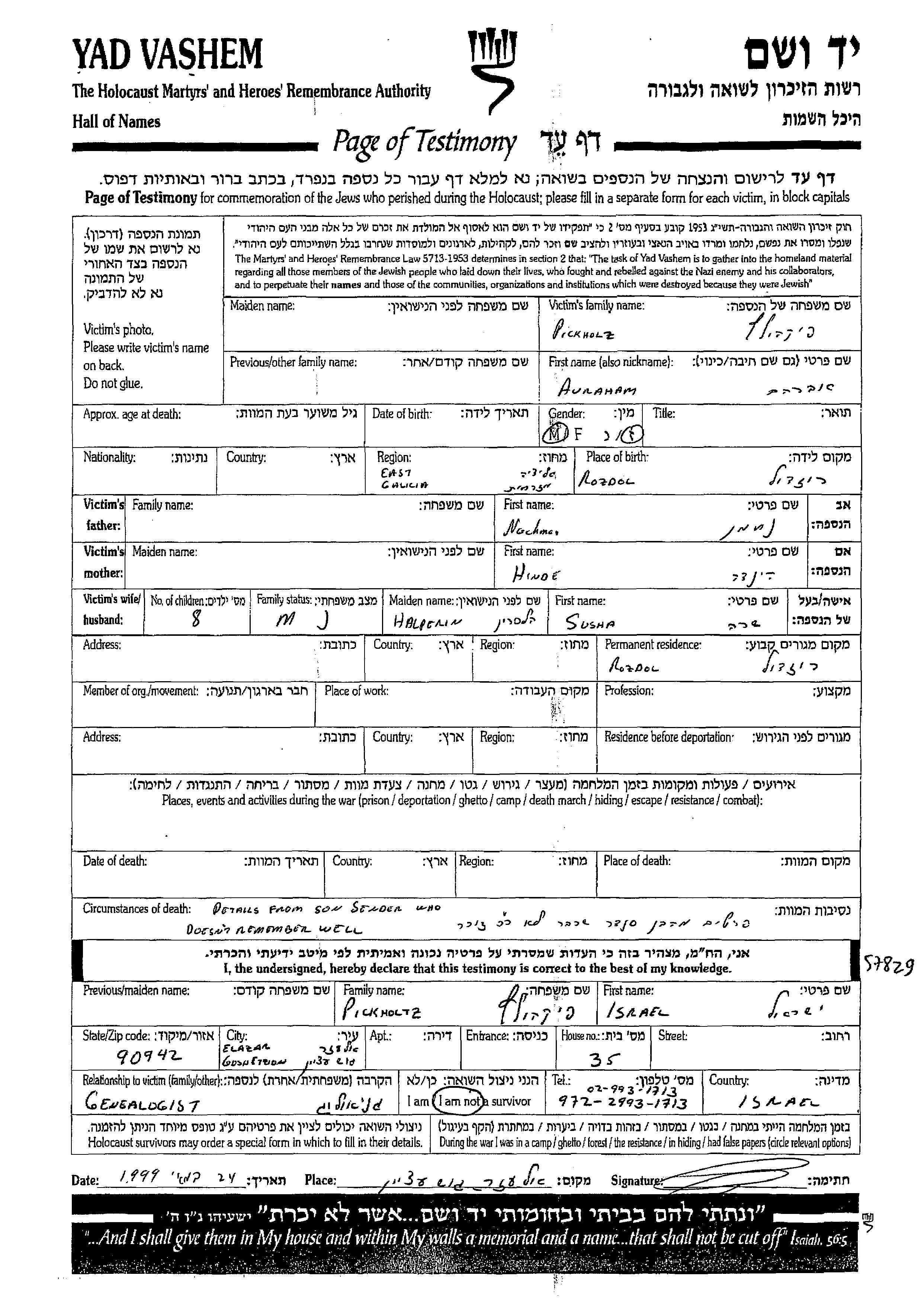 Avraham Pickholz wurde in Rozdol, Polen geboren. Er war der Sohn von Nachman und Hinde. Er war mit Susha Sara, geb. Halperin Verheiratet. Vor dem Zweiten Weltkrieg lebte er in Rozdol, Polen.