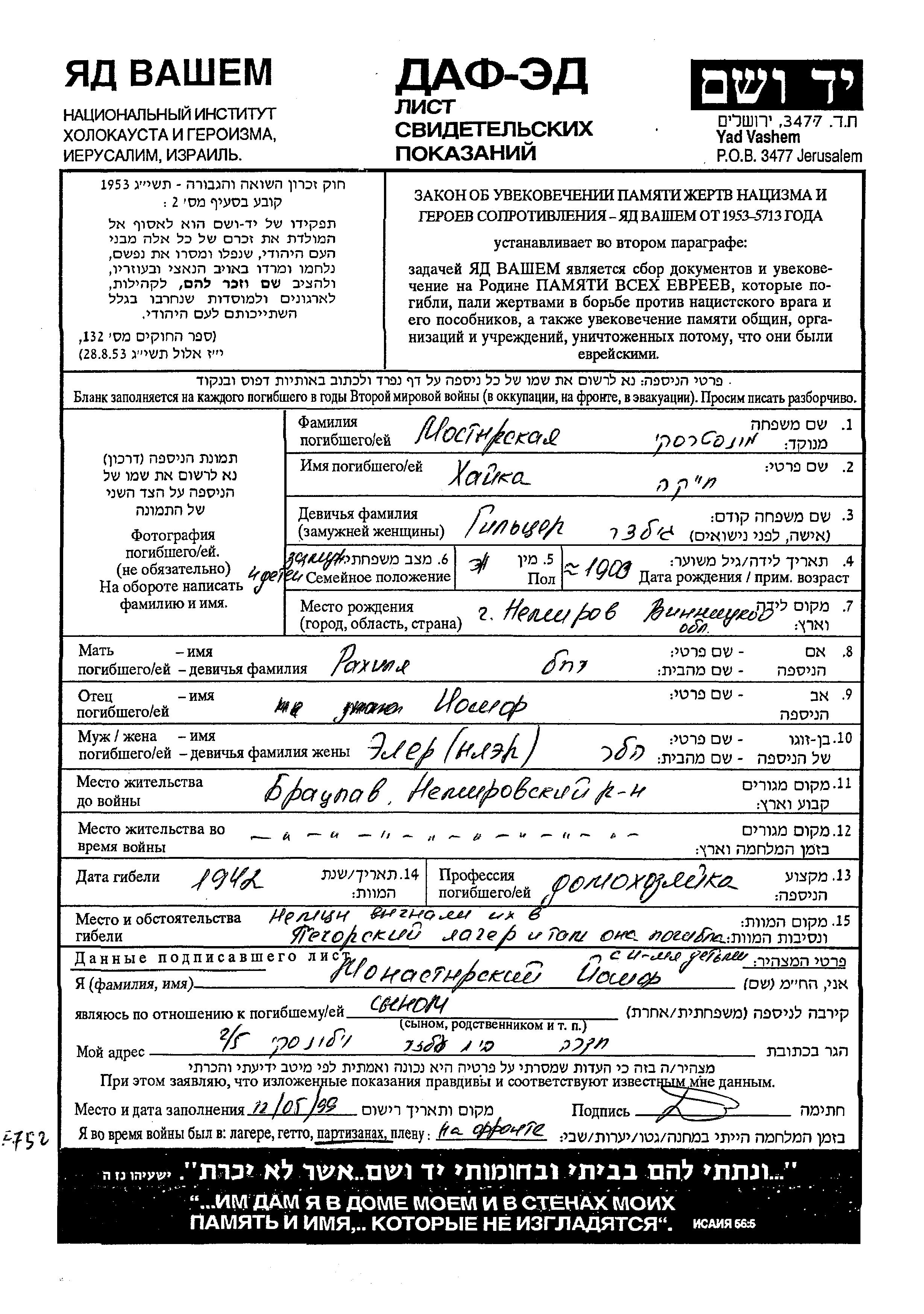 Khaika Monastyrski, geb. Giltzer wurde im Jahr 1900 in Nemirov, Ukraine (UdSSR) geboren. Sie war die Tochter von Iosif und Rakhilya. Sie war Hausfrau und mit Yler Eler Verheiratet. Vor dem Zweiten Weltkrieg lebte sie in Bratzlav, Ukraine (UdSSR). Während des Krieges war sie in Bratzlav, Ukraine (UdSSR).