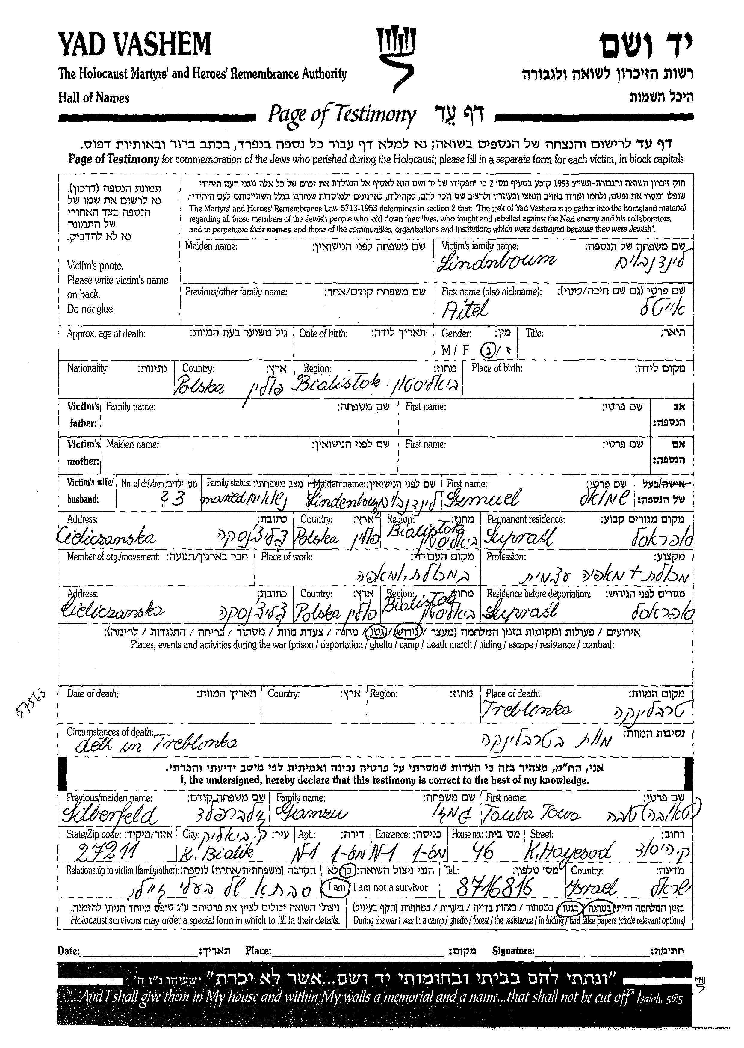 Aitel Eitel Lindnboum wurde in Bialystok, Polen geboren. Sie war Besitzer/-in eines lebensmittelgeschäfts und mit Szmuel Verheiratet. Vor dem Zweiten Weltkrieg lebte sie in Suprasl, Polen. Während des Krieges war sie in Suprasl, Polen.