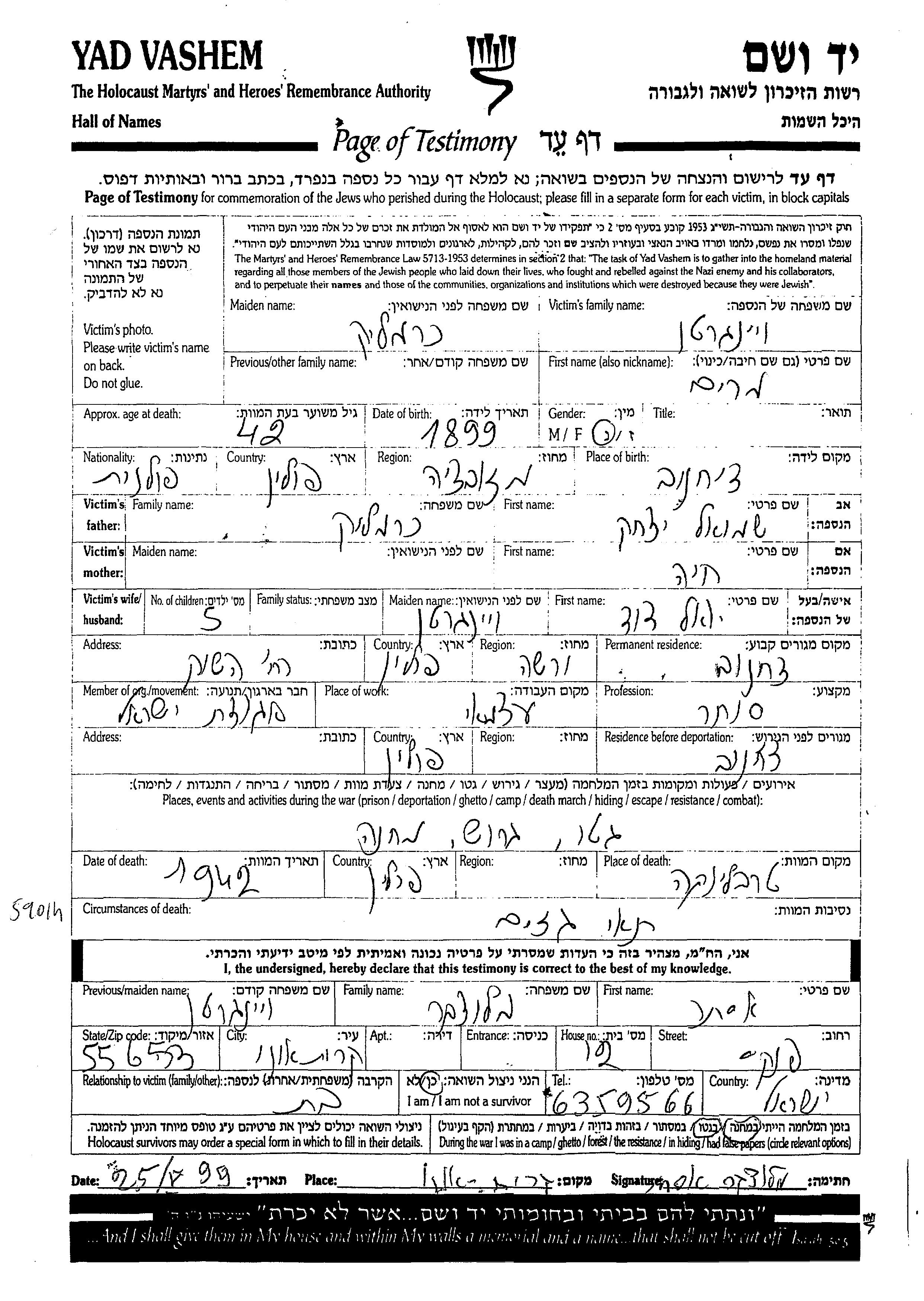 Miriam Veingarten, geb. Karmeliuk wurde im Jahr 1899 in Ciechanow, Polen geboren. Sie war die Tochter von Shmuel Yitzkhak und Khaia. Sie war Kaufmann/-frau und mit Yoel David Verheiratet. Vor dem Zweiten Weltkrieg lebte sie in Ciechanow, Polen. Während des Krieges war sie in Ciechanow, Polen.