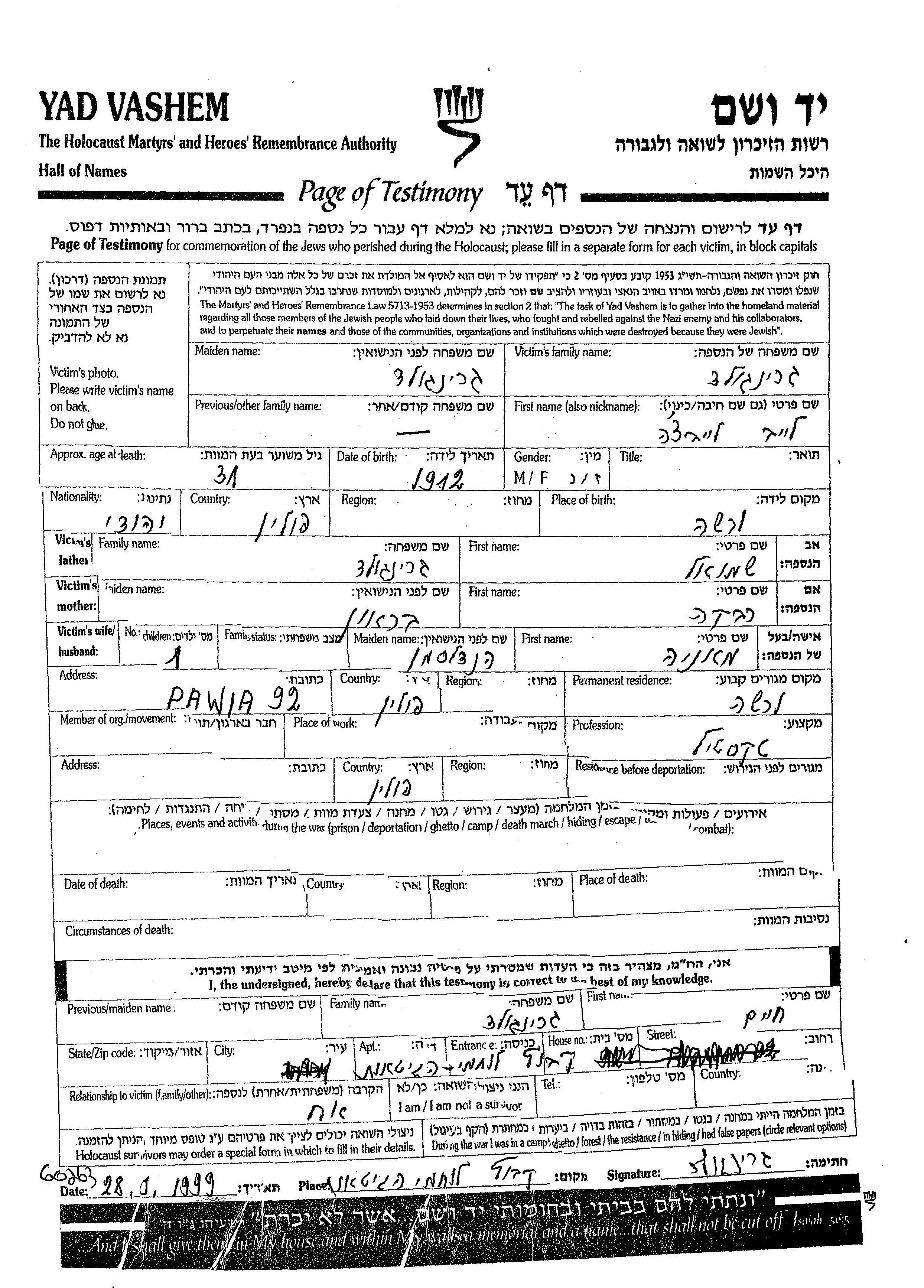 Leib Gringold wurde im Jahr 1912 in Warsaw, Polen geboren. Er war der Sohn von Shmuel und Rivka. Er war mit Mania, geb. Handelsman Verheiratet. Vor dem Zweiten Weltkrieg lebte er in Warsaw, Polen. Während des Krieges war er in Polen.