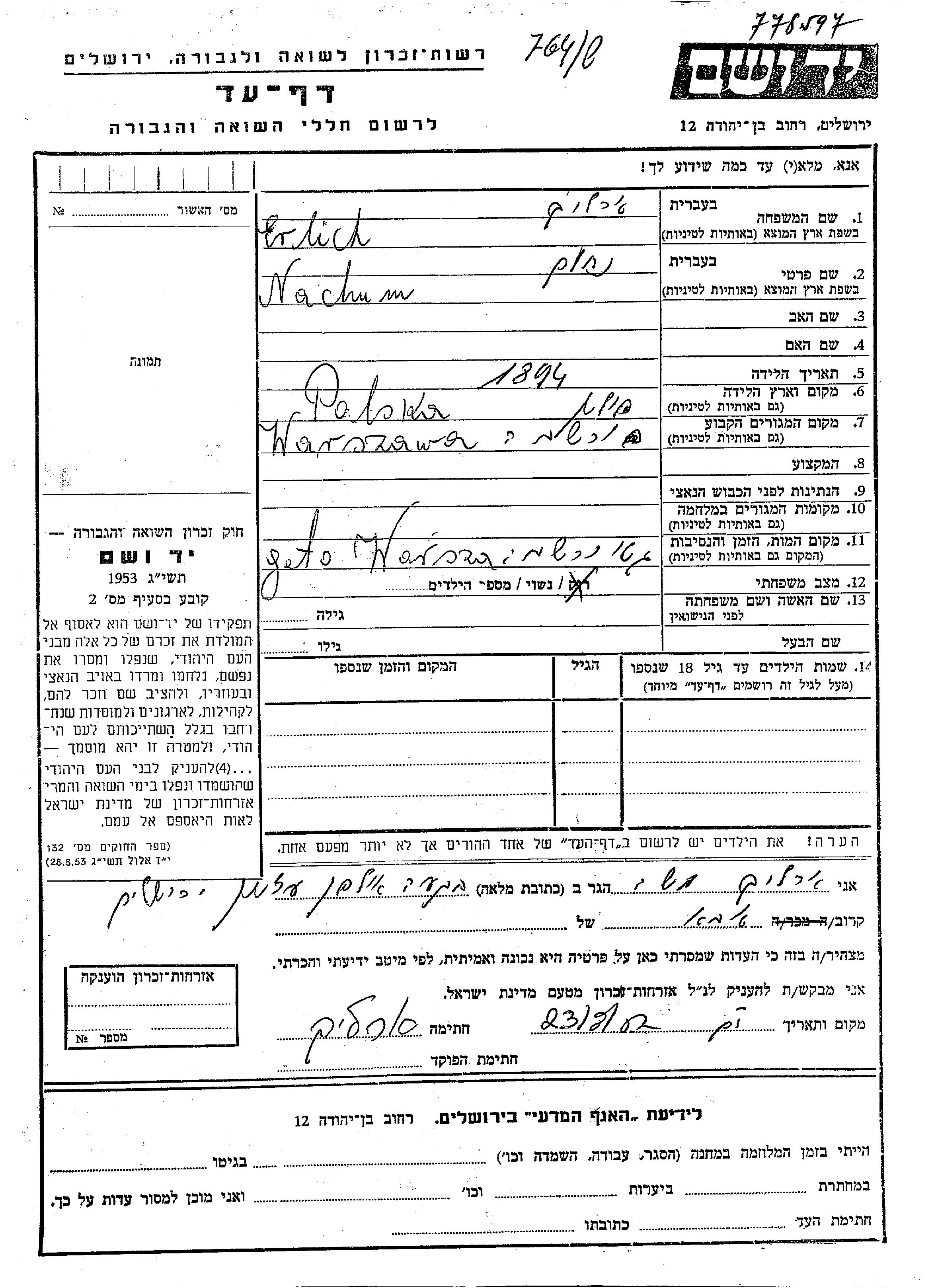 Nachum wurde in der Schoah ermordet. Todesort: Warszawa, Polen.