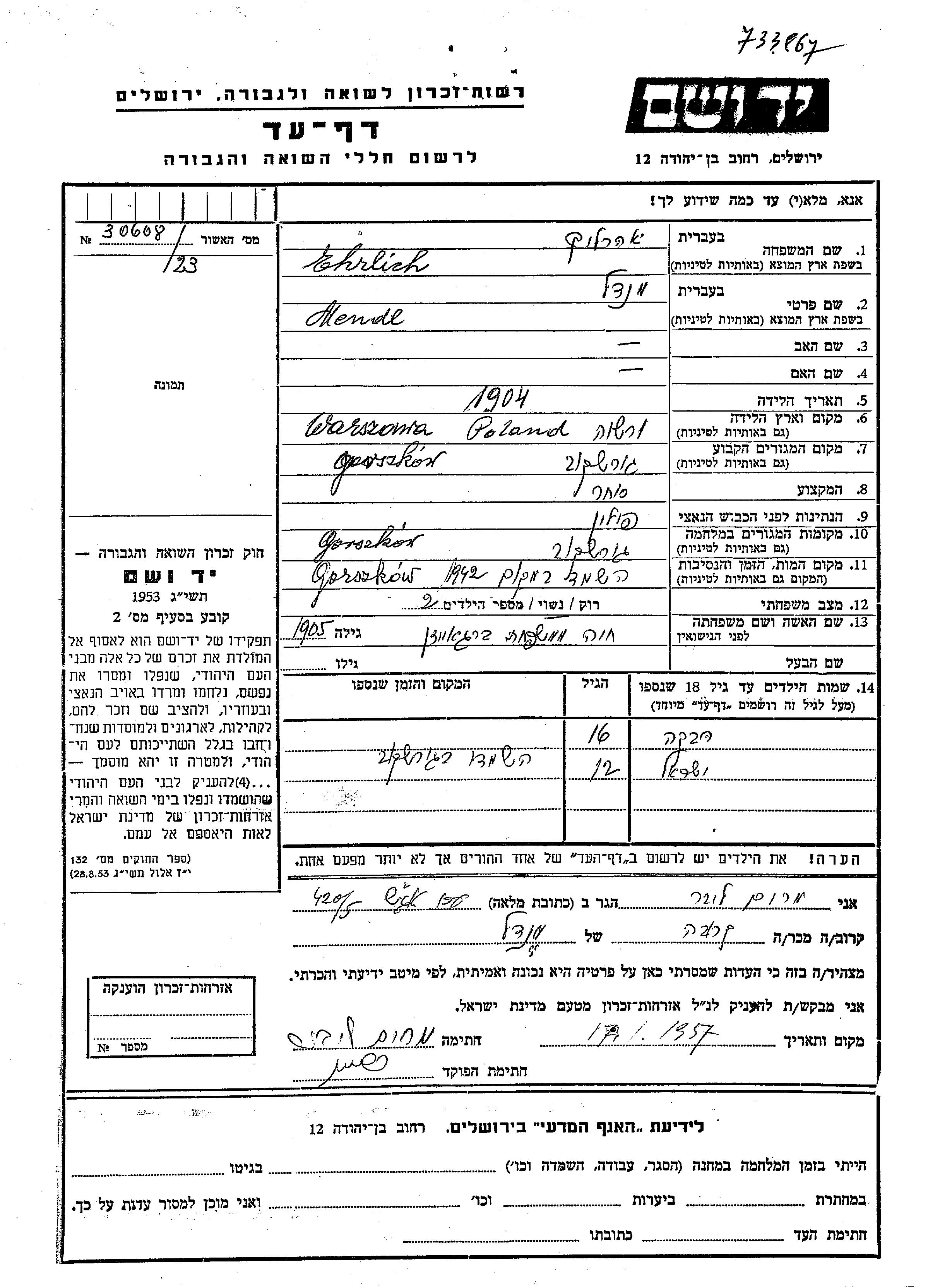Mendl Ehrlich wurde im Jahr 1904 in Warszawa, Polen geboren. Er war Kaufmann/-frau und mit Khaia, geb. Bergeizen Verheiratet. Vor dem Zweiten Weltkrieg lebte er in Gorszkow, Polen. Während des Krieges war er in Gorszkow, Polen.