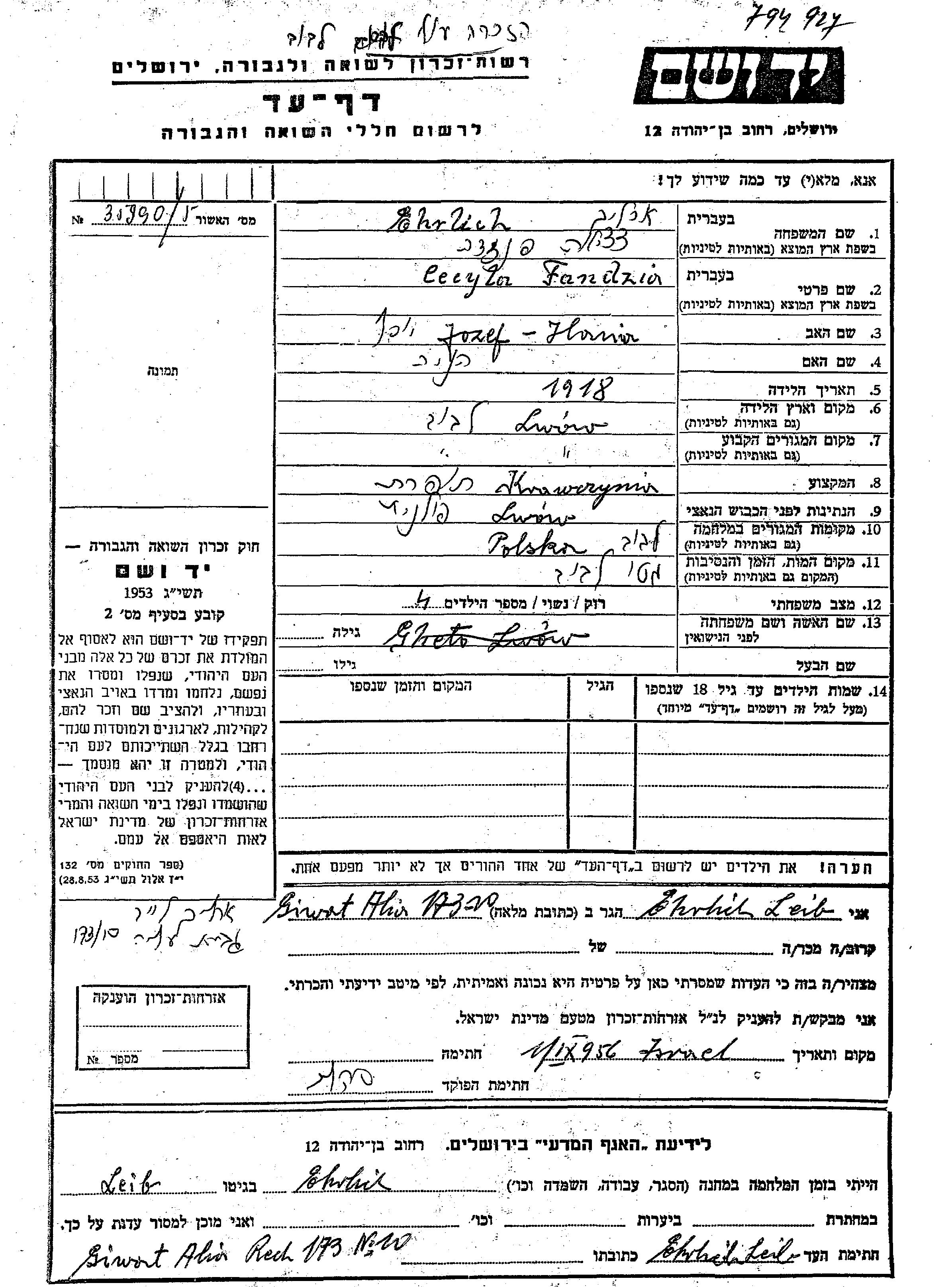 Cecyla Fandzia Ehrlich wurde im Jahr 1918 in Lwow, Polen geboren. Sie war die Tochter von Jozef und Honia Henia. Sie war Schneiderin und Verheiratet. Vor dem Zweiten Weltkrieg lebte sie in Lwow, Polen. Während des Krieges war sie in Lwow, Polen.