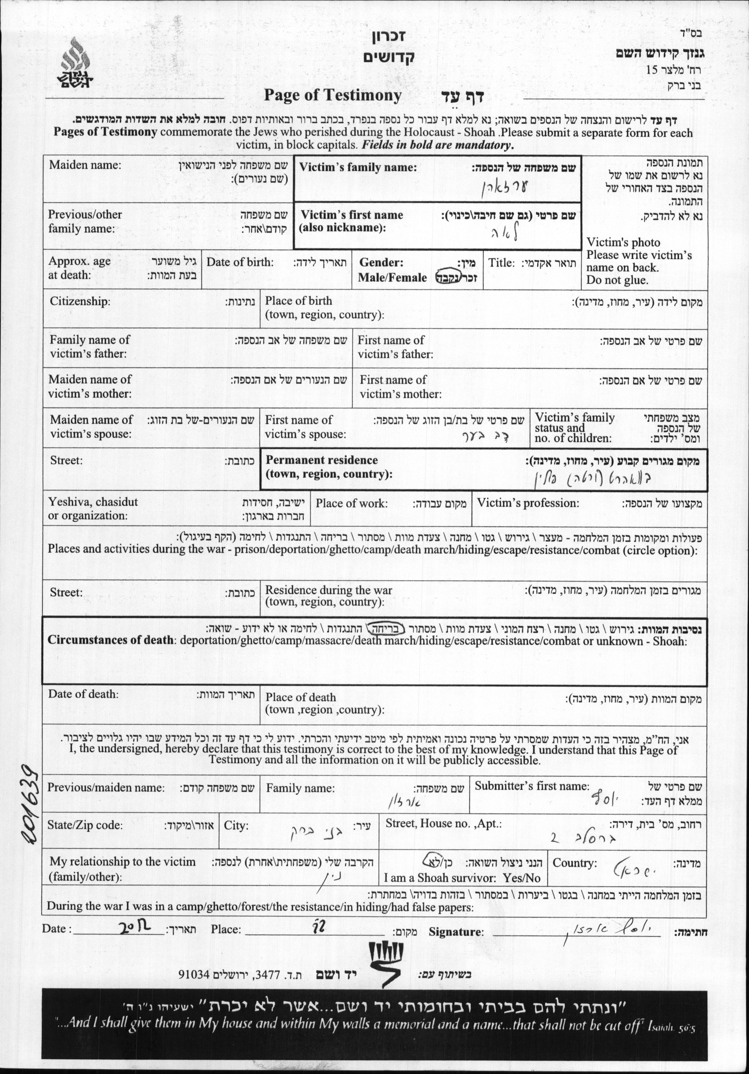 Lea Herzohn. Sie war mit Dov Ber Verheiratet. Vor dem Zweiten Weltkrieg lebte sie in Warta, Polen.