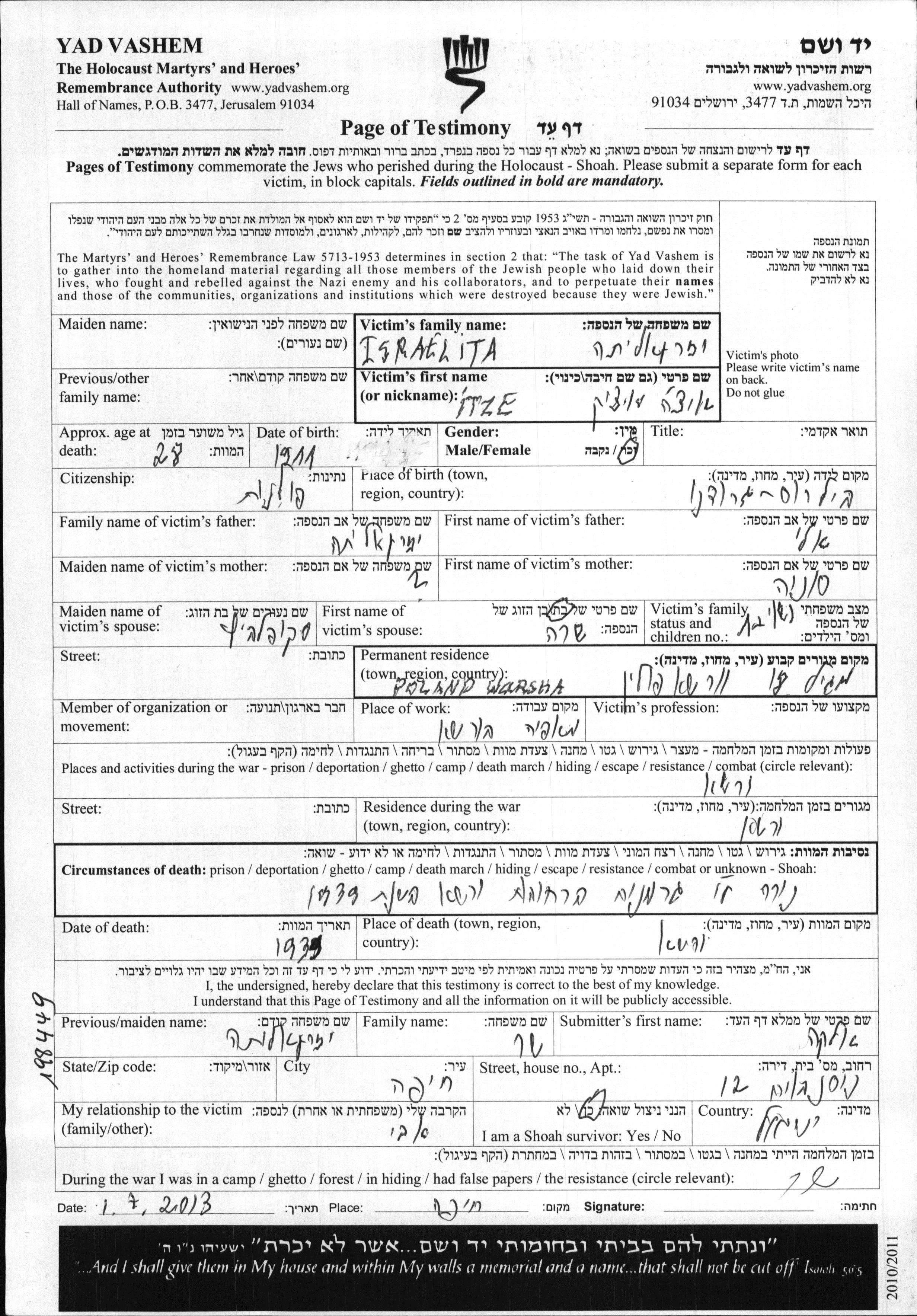 Itze Israelita wurde im Jahr 1911 in Grodno, Polen geboren. Er war der Sohn von Eli und Sonia. Er war mit Sara, geb. Skopelevich Verheiratet. Vor dem Zweiten Weltkrieg lebte er in Warszawa, Polen. Während des Krieges war er in Warszawa, Polen.