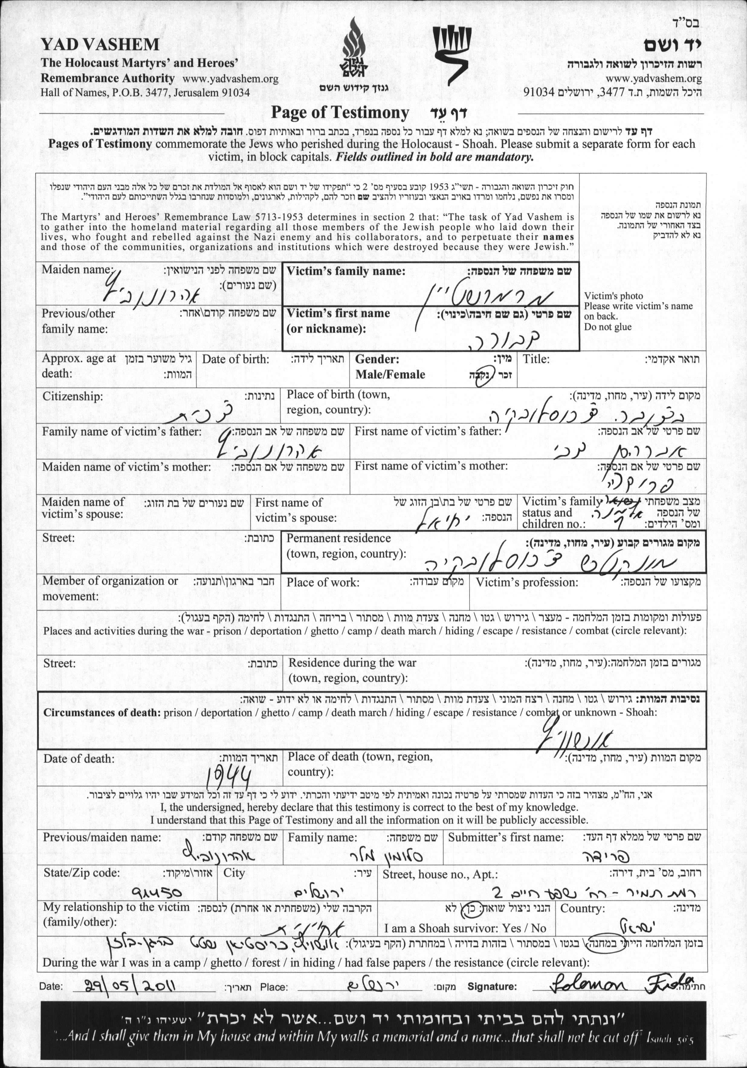 Dvora Mermershtein, geb. Ahronovitz wurde in Bachovo, Tschechoslowakei geboren. Sie war die Tochter von Avraham Tzvi und Frida. Sie war mit Yekhiel Witwe. Vor dem Zweiten Weltkrieg lebte sie in Munkac, Tschechoslowakei.