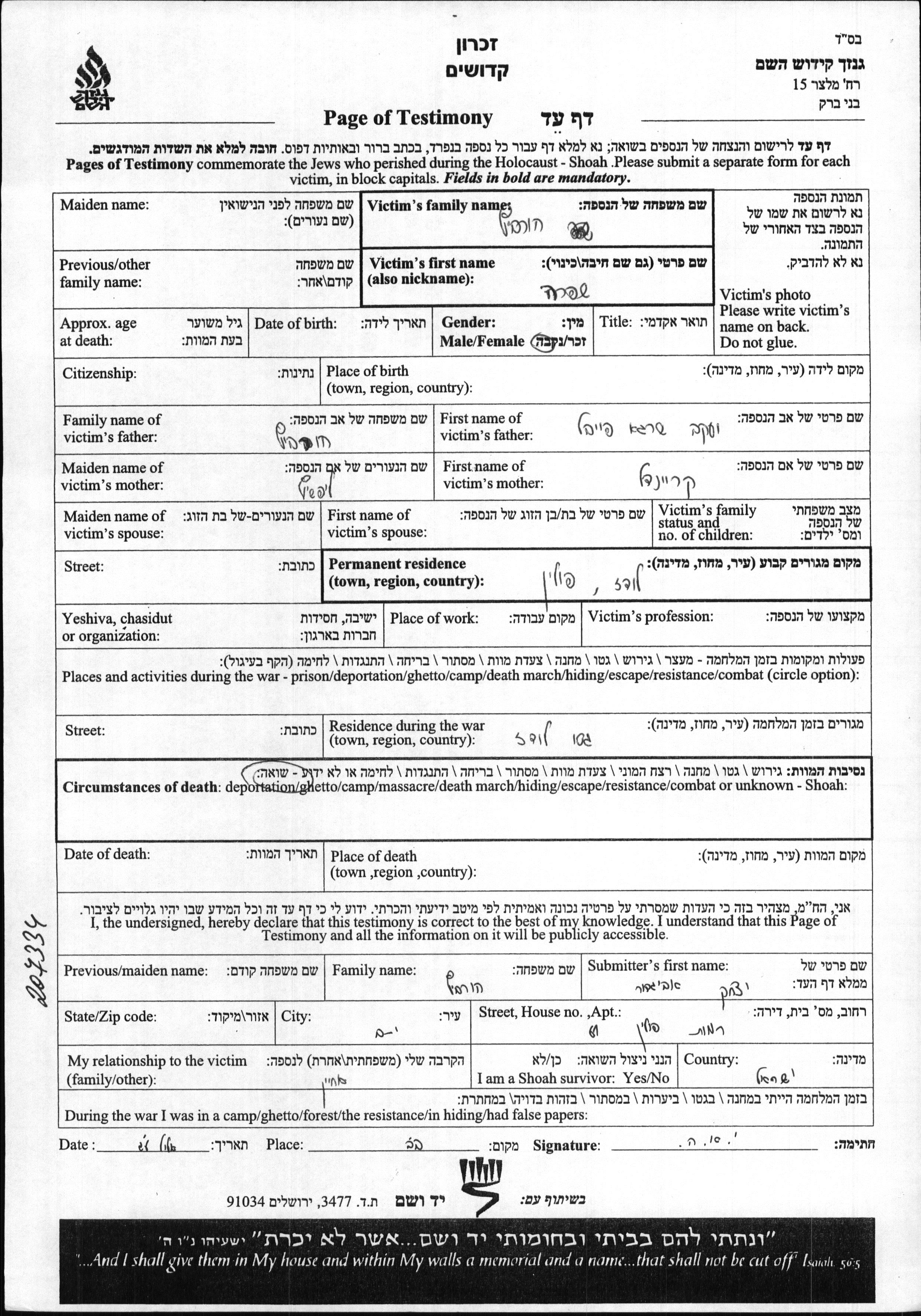 Horvitz Shifra Lodz, Polen Gedenkblatt