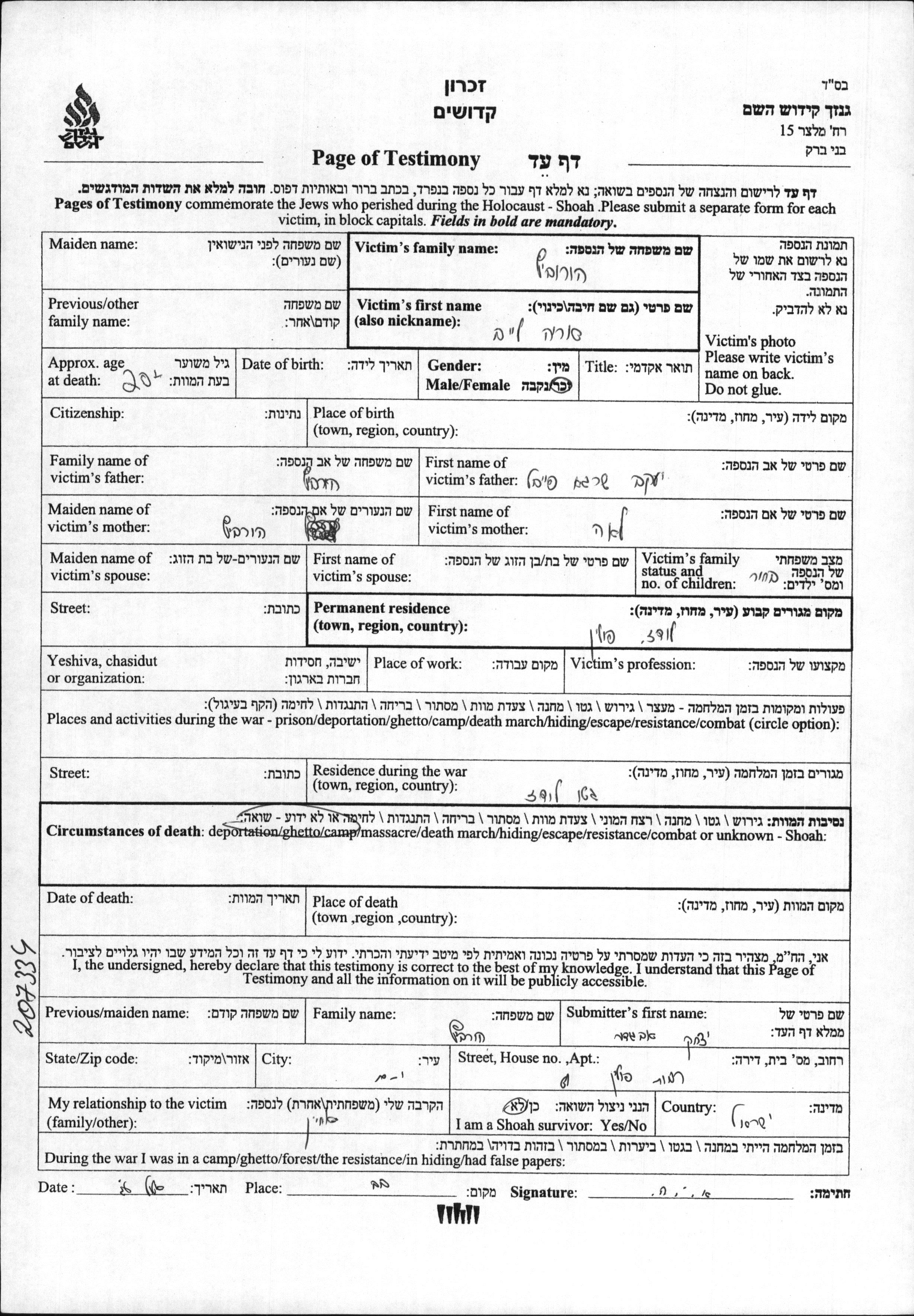 Arie Leib Horvitz wurde Er war der Sohn von Yaakov Shraga Faivel und Lea. Er war Ledig. Vor dem Zweiten Weltkrieg lebte er in Lodz, Polen. Während des Krieges war er in Lodz, Polen.