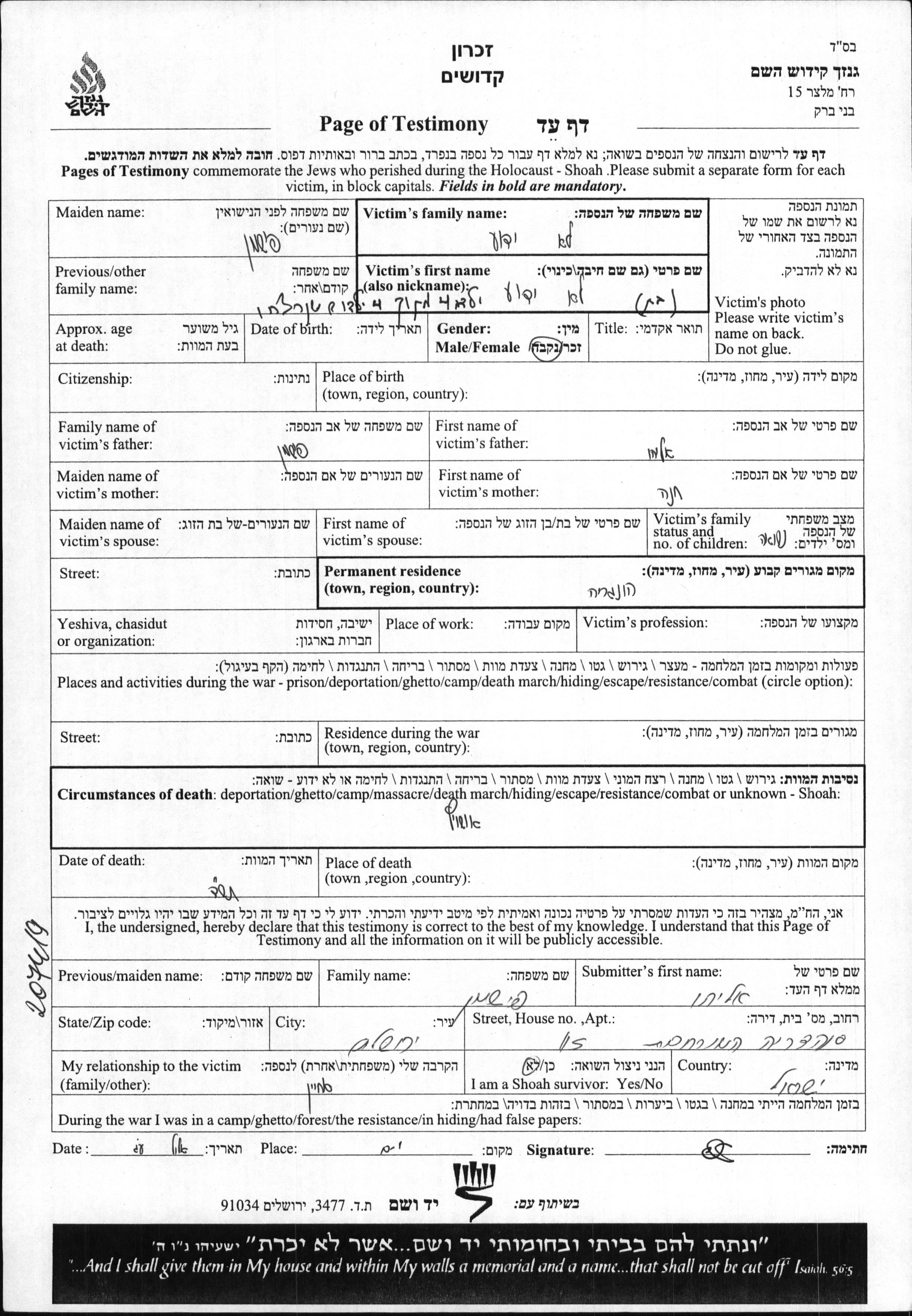 Vorname unbekannt Name unbekannt, geb. Pishman wurde Sie war die Tochter von Eliahu und Chana. Sie war Verheiratet. Vor dem Zweiten Weltkrieg lebte sie in Ungarn.