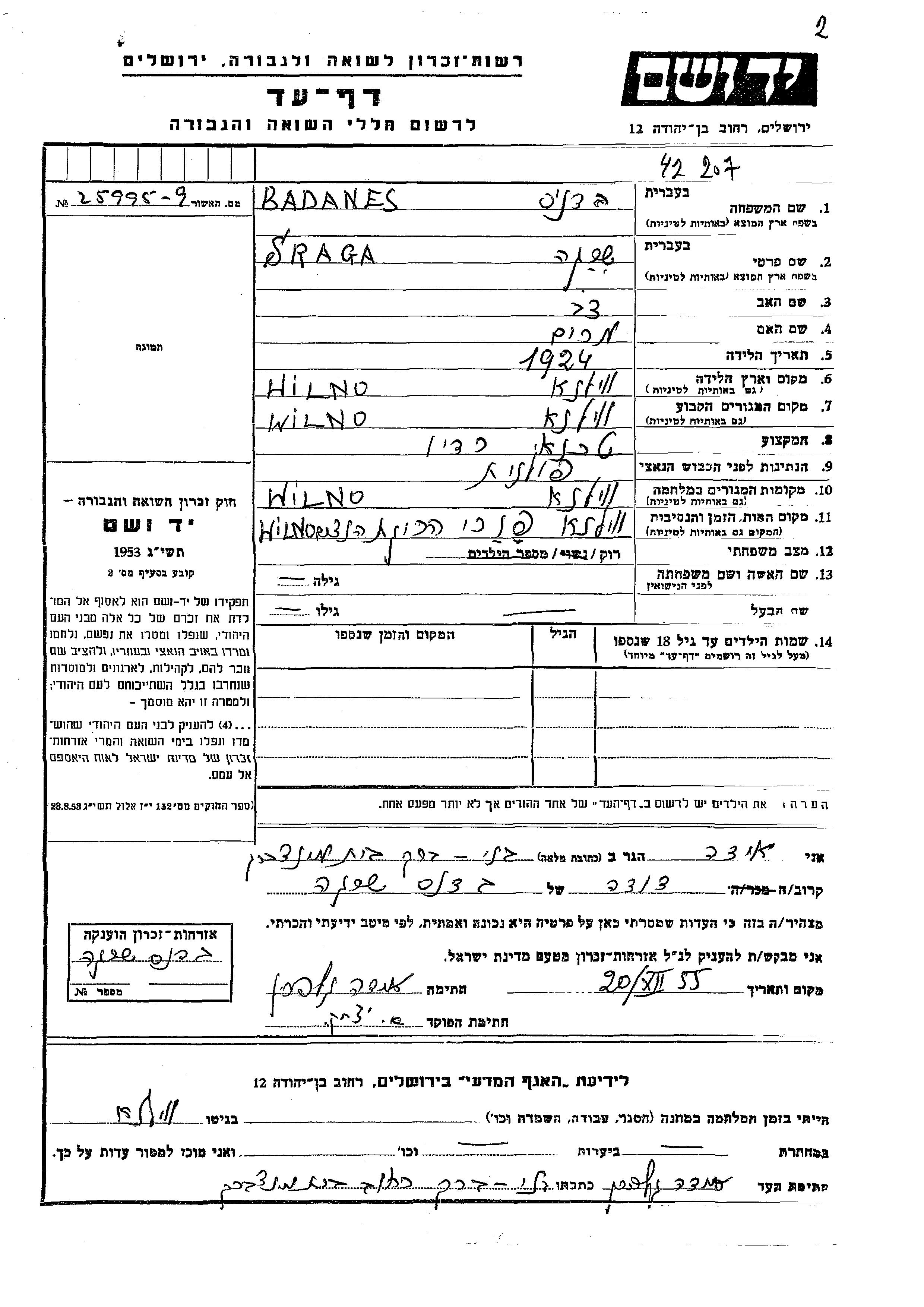 Sraga Badanes est né à Wilno, Polen en 1924, fils de Dov et de Miriam. Il était Radiotechniker et Célibataire. Avant la seconde guerre mondiale il vivait à Wilno, Polen. Au cours de la guerre, il était à Wilno, Polen.