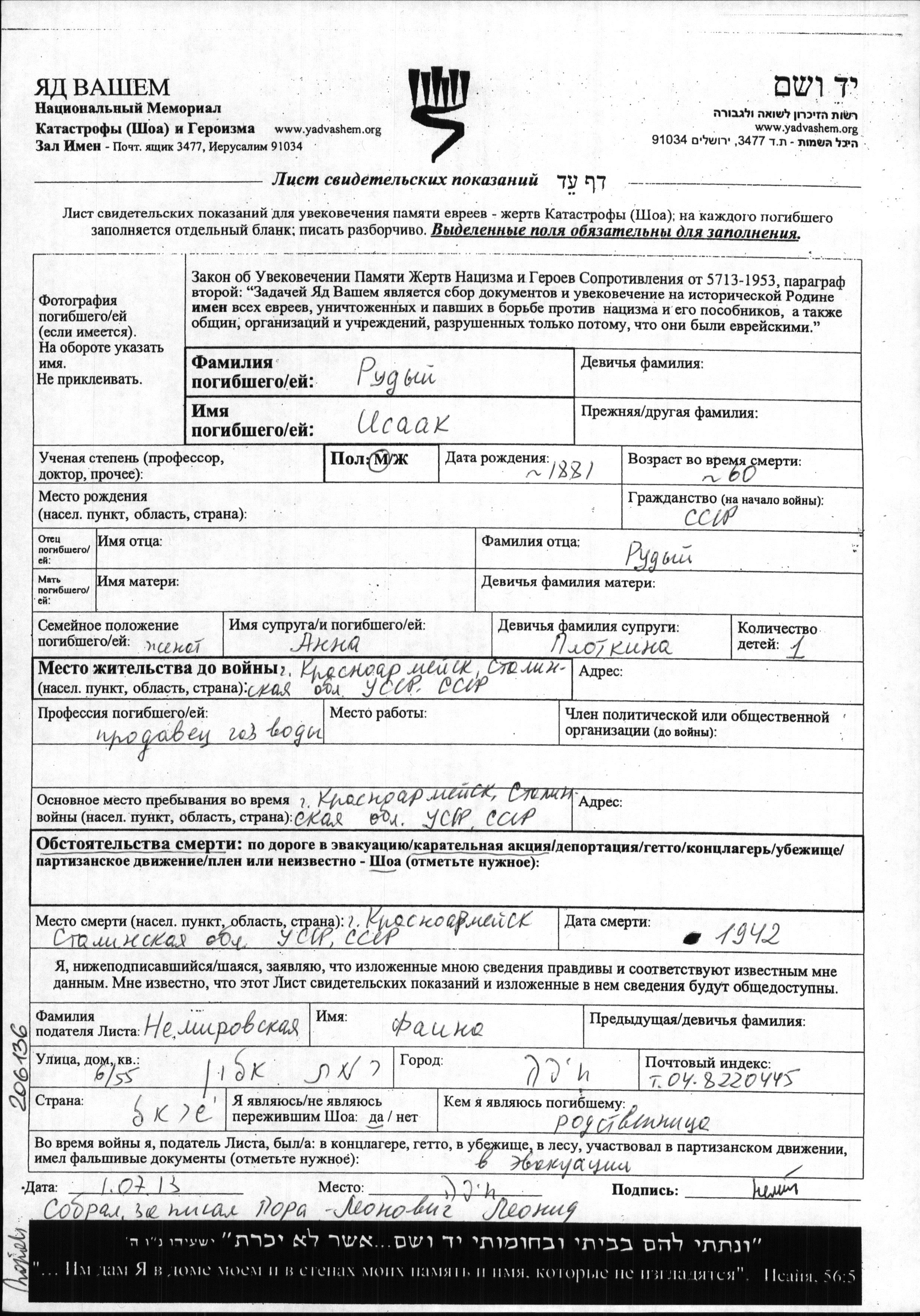 Isaak Rudy wurde im Jahr 1881 geboren. Er war Prodavets gazirovannoi vody russian und mit Anna, geb. Plotkina Verheiratet. Vor dem Zweiten Weltkrieg lebte er in Krasnoarmeysk, Ukraine (UdSSR). Während des Krieges war er in Krasnoarmeysk, Ukraine (UdSSR).