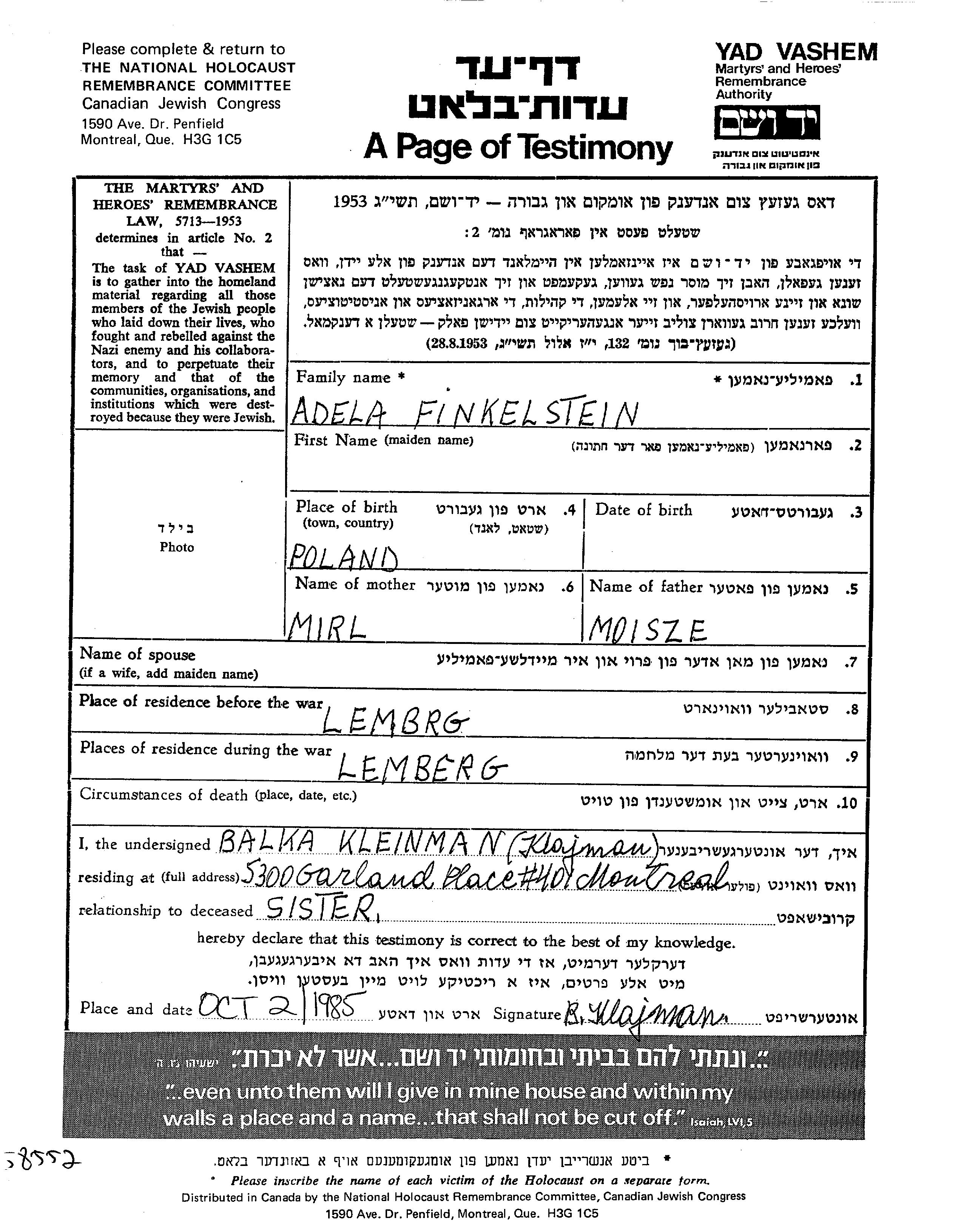 Finkelstein Adela Lemberg, Polen Gedenkblatt