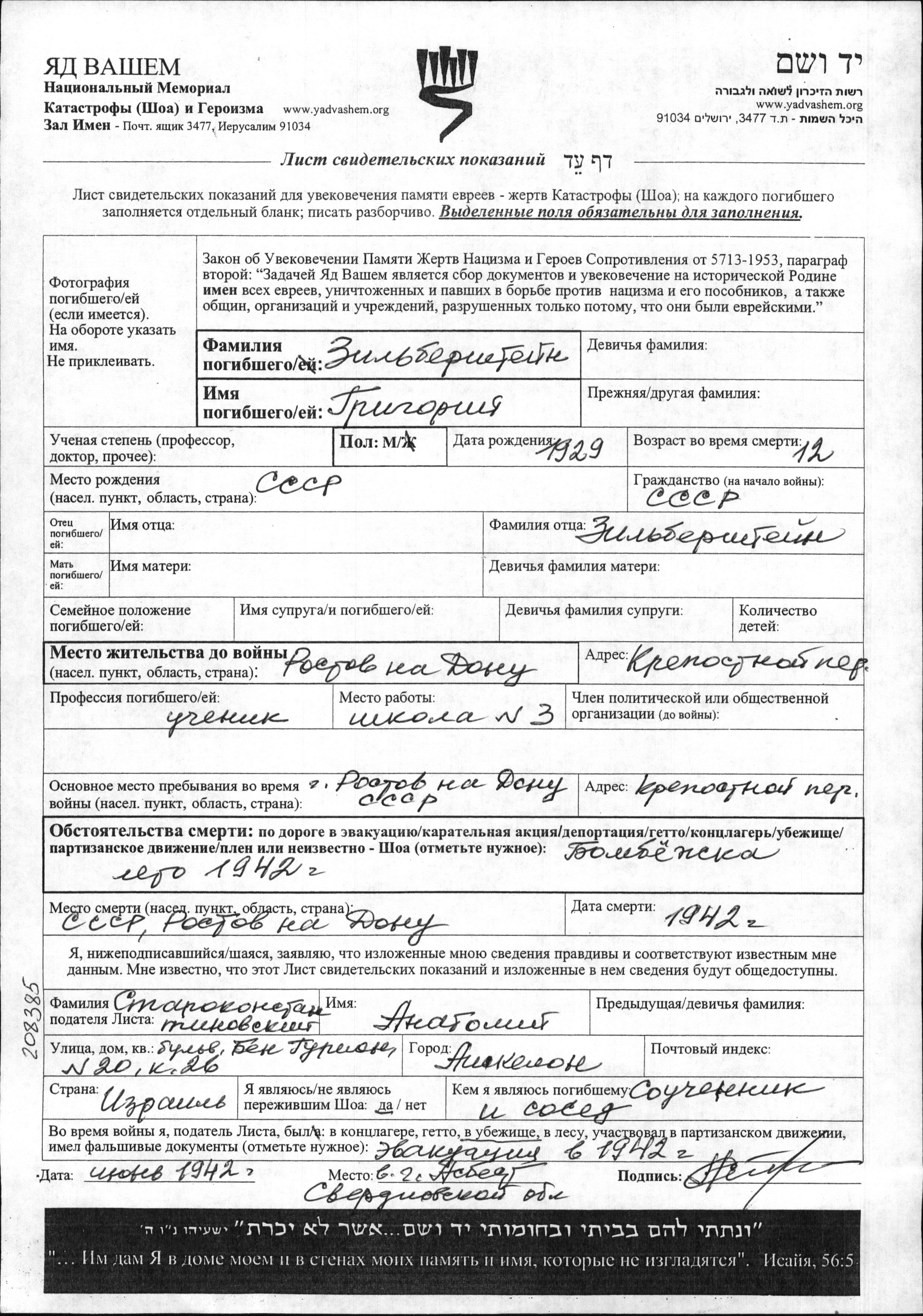 Grigoriy Zilbershteyn wurde im Jahr 1929 in Sowjetunion geboren. Er war Schüler/-in. Vor dem Zweiten Weltkrieg lebte er in Rostov na Donu, Russland (UdSSR). Während des Krieges war er in Rostov na Donu, Russland (UdSSR).