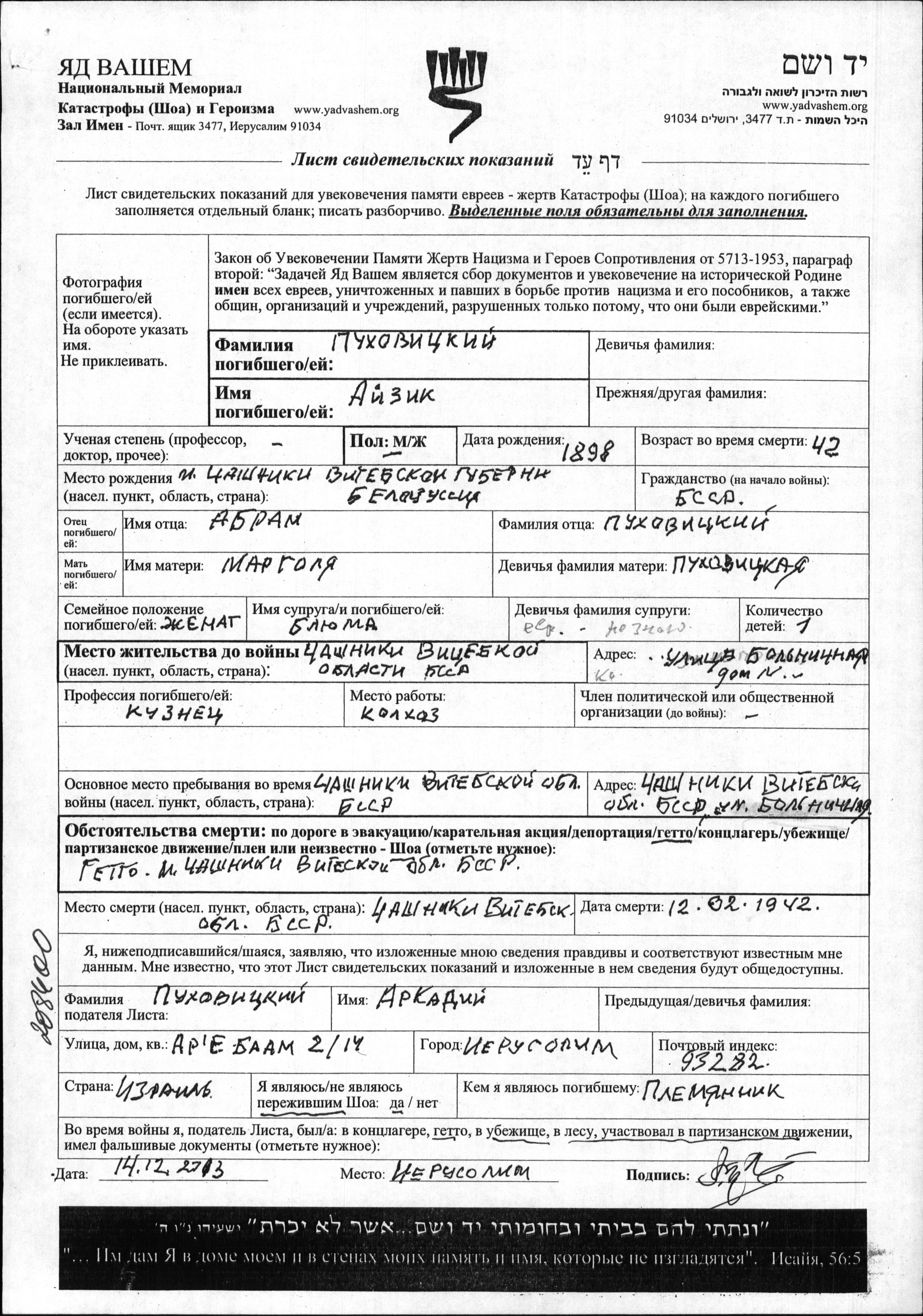 Ayzik Pukhovitzki wurde im Jahr 1898 in Chashniki, Weißrussland (UdSSR) geboren. Er war der Sohn von Abram und Margolya. Er war Schmied und mit Blyuma Verheiratet. Vor dem Zweiten Weltkrieg lebte er in Chashniki, Weißrussland (UdSSR). Während des Krieges war er in Getto.