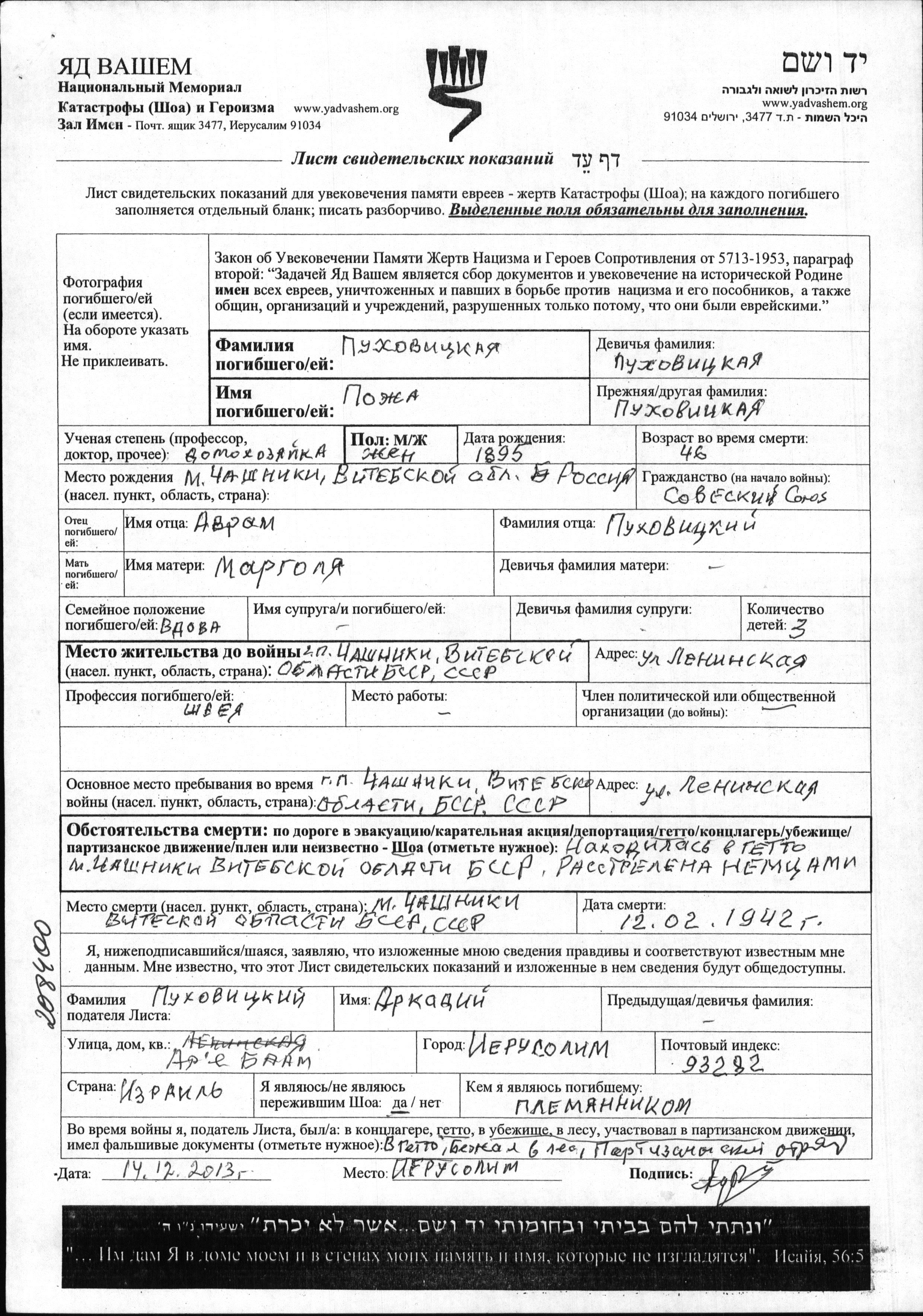 Pozha wurde in der Schoah ermordet. Todesort: Chashniki, Weißrussland (UdSSR) im Jahr 12/02/1942.