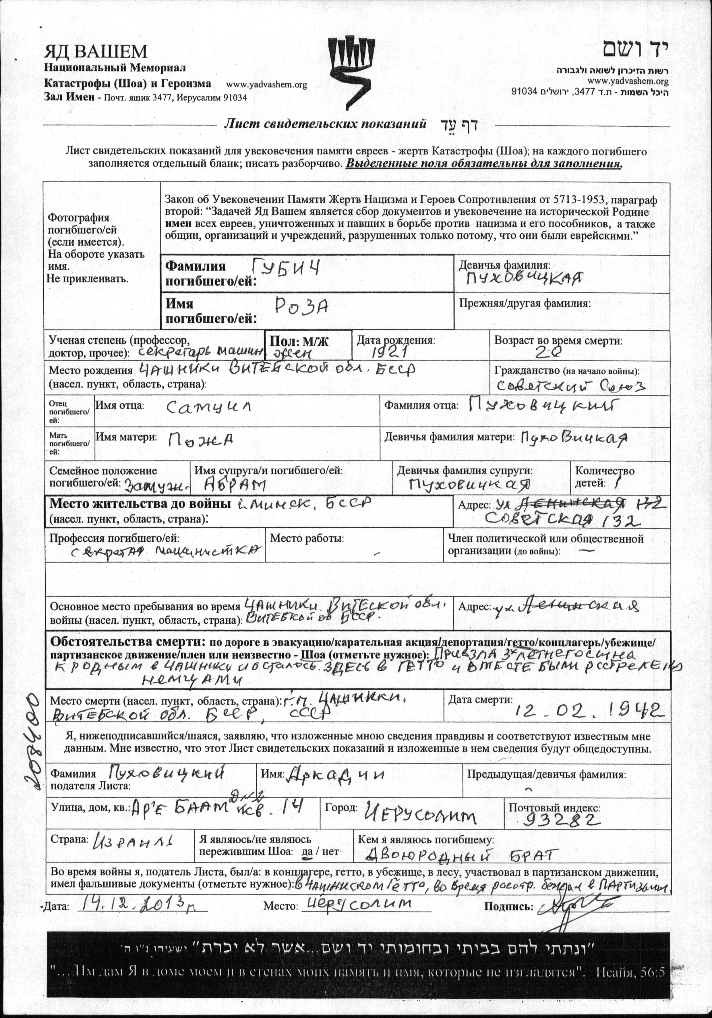 Roza Gubich, geb. Pukhovitzkaya wurde im Jahr 1921 in Chashniki, Weißrussland (UdSSR) geboren. Sie war die Tochter von Samuil und Pozha. Sie war Sekretärin/schreibkraft und mit Abram Verheiratet. Vor dem Zweiten Weltkrieg lebte sie in Minsk, Weißrussland (UdSSR). Während des Krieges war sie in Chashniki, Weißrussland (UdSSR).